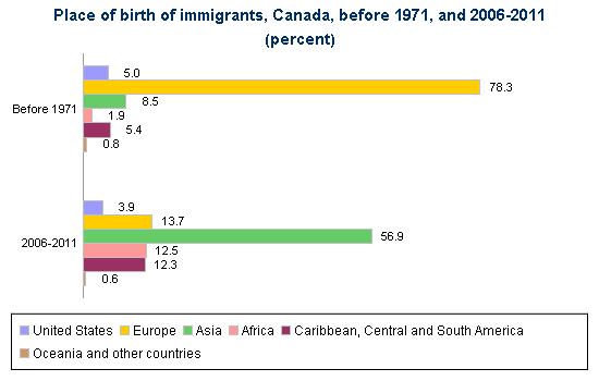 The graph above shows the different backgrounds of Canadian immigrants for different years and different points in history. Before 1976 most of Canada's immigrants were from Europe this would be because of Britain's influence on Canada, the lowest amount of people were coming from Oceania and other country which means that only a few large countries such as Asia and Europe were bring people into Canada and making up the population. However from 2006-2001 the amounts have completely changed. The amount of people Europe brings in has decreased greatly and the number of people that Asia brings in has sky-rocketed. This could be due to the living conditions in certain places in Asia. Also the rate of people coming from America has decreased but Africa and the Caribbean has increased greatly and are most the same rate.