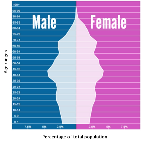 The population pyramid above shows the current population of Canada, the pyramid is smaller at the bottom and than gets bigger towards the middle and than starts to shrink again. This means the population is not equal, the bottom of the pyramid (ages 0-24) is smaller than the rest which means their are less people of that age and more older people. Where the pyramids starts to get bigger is where the baby boomers are right now, which is why it is so much more larger than the other age groups. Lastly, the smaller part at the top of the pyramids is where the baby boomers parents are currently, however both the baby boomers and their parents make up more of the population than the younger ages.