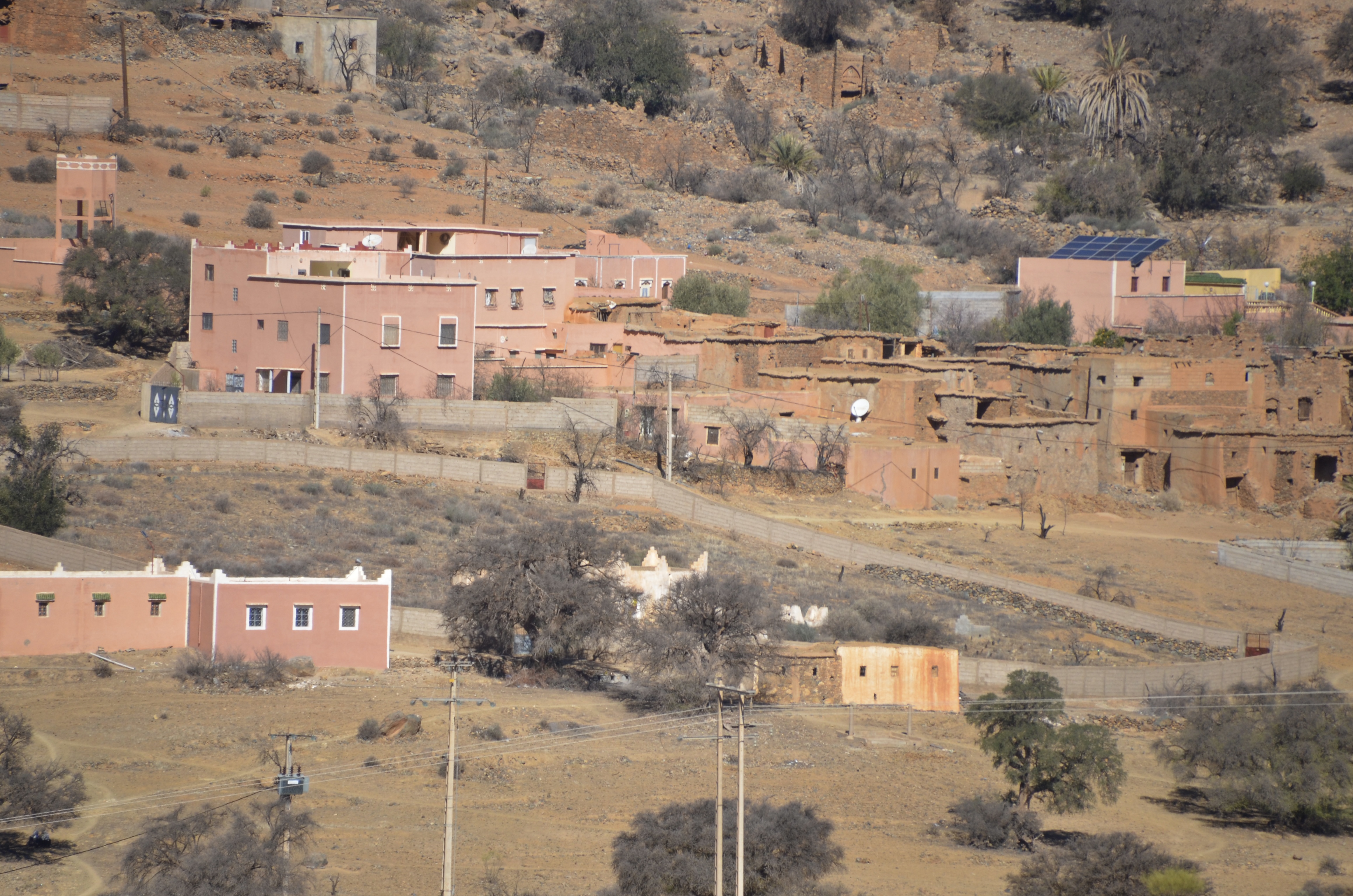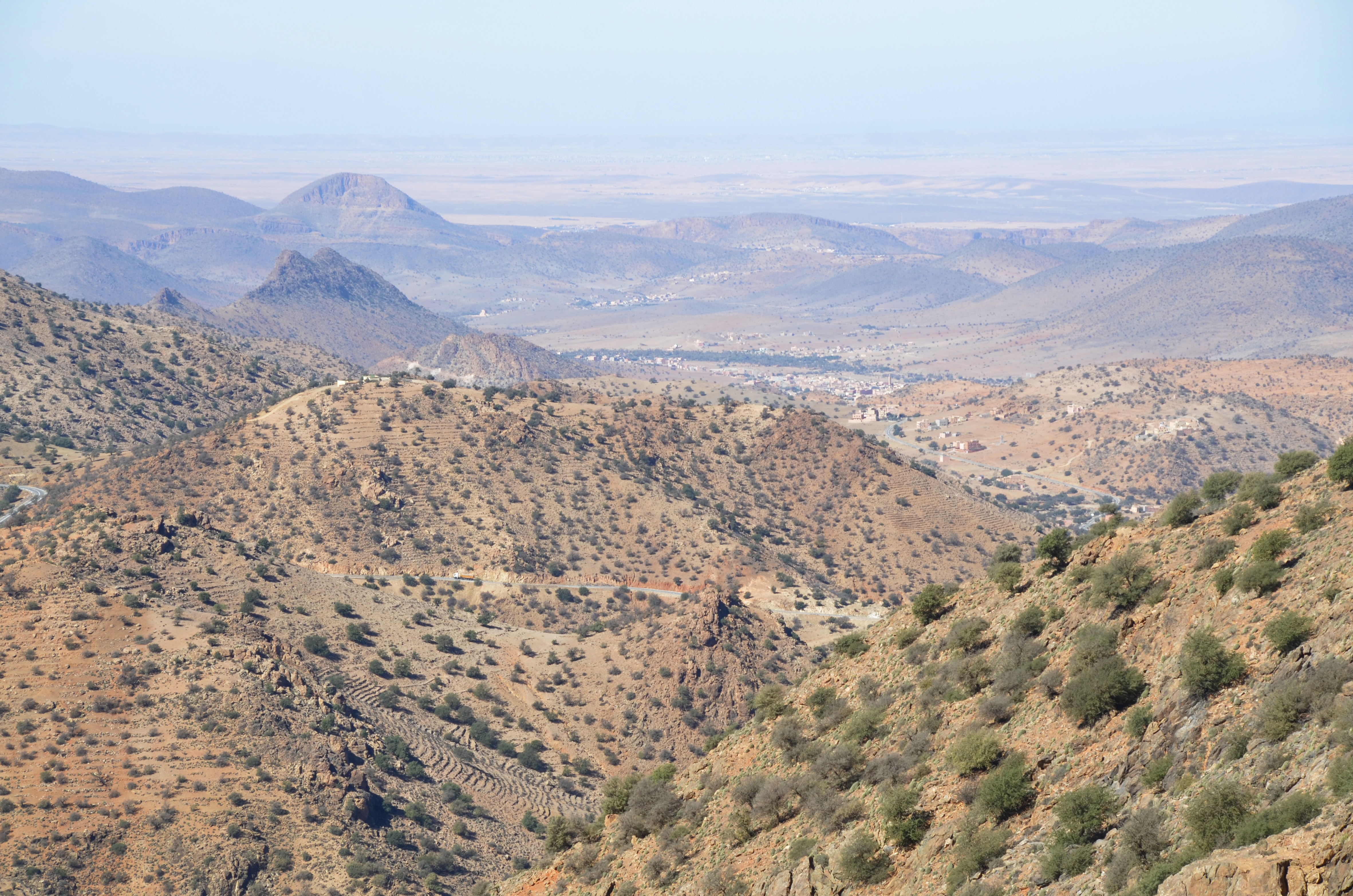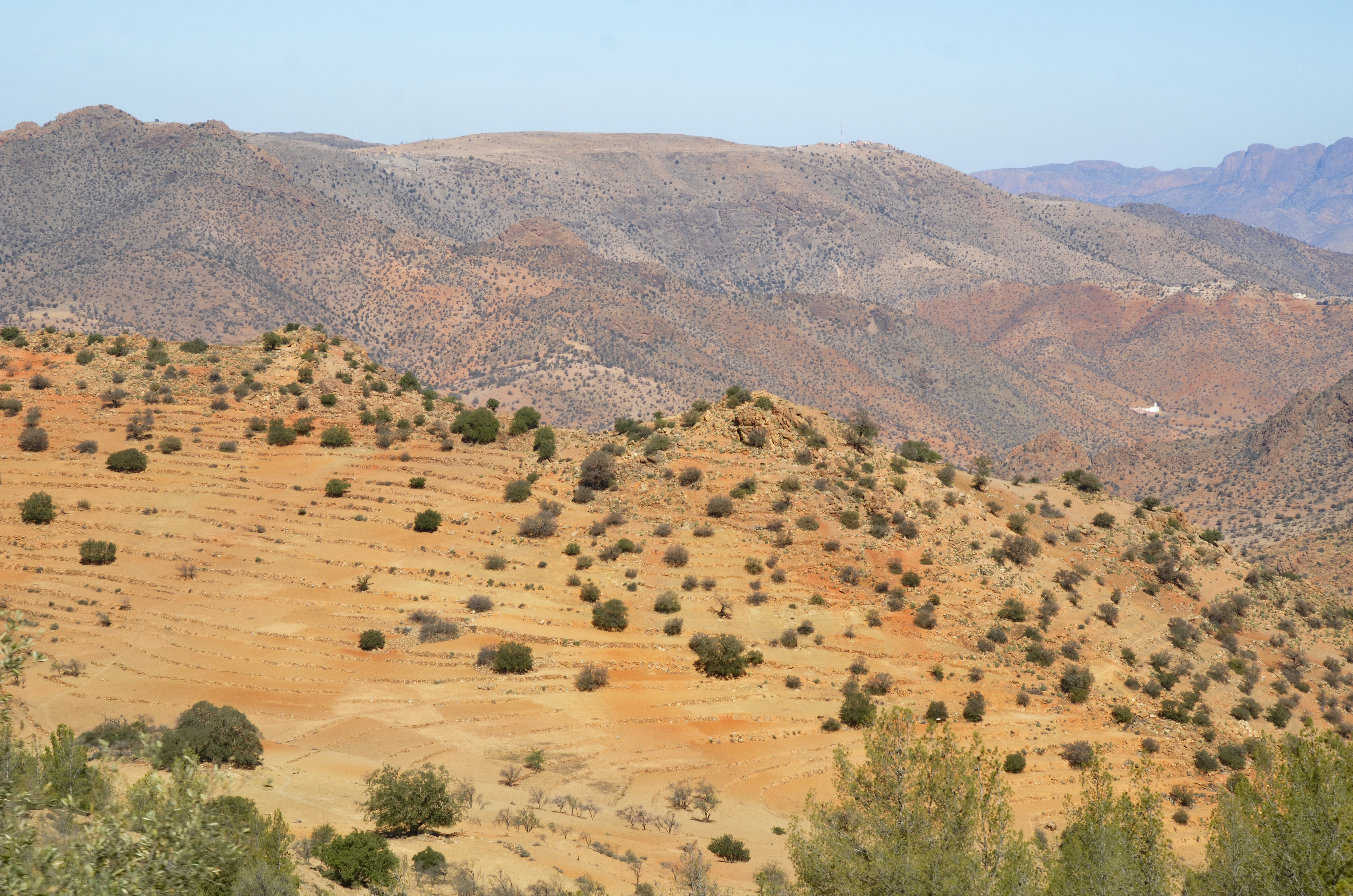 Sur la route aux paysages de moyenne montagne, l’on retrouve les vastes étendues plantées d’arganiers, pas toujours en bonne santé. Beaucoup d’arbres secs hélas.