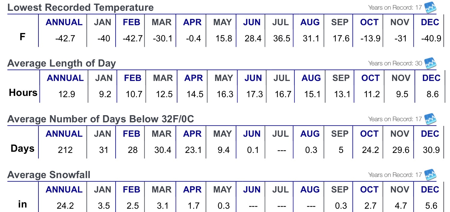 Average temperature year round is 32 degrees Fahrenheit (0 degrees Celsius).