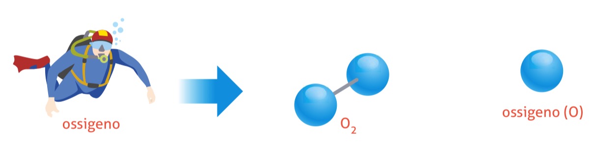 Invece la molecola dell'ossigeno è formata da due atomi dello stesso elemento (O2).