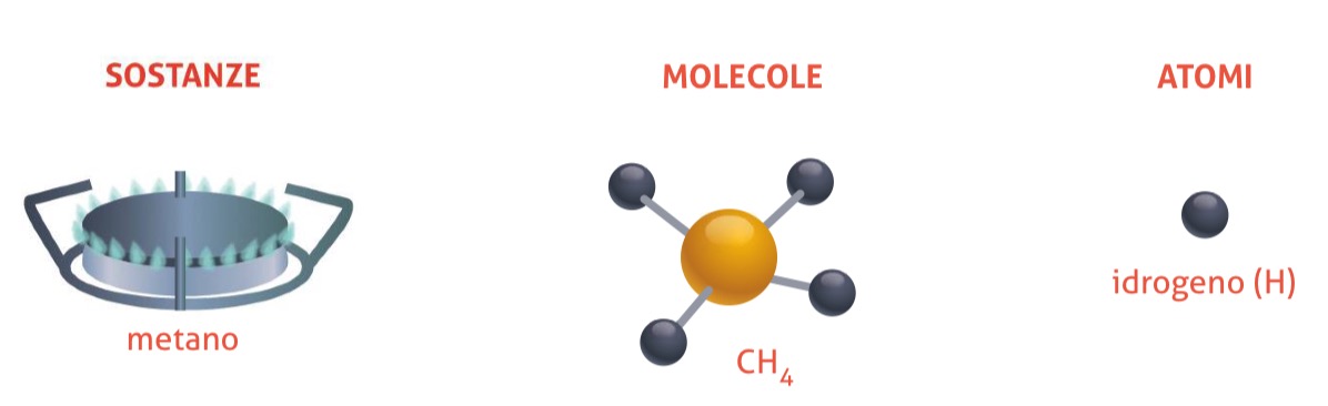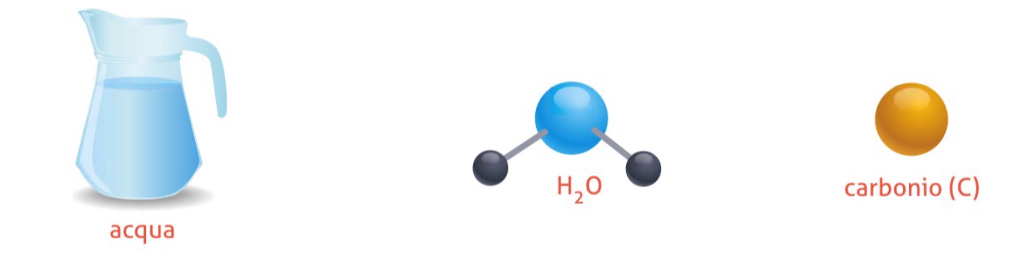Per esempio, l'acqua è una molecola formata da due atomi di idrogeno (H) e uno di ossigeno (O).