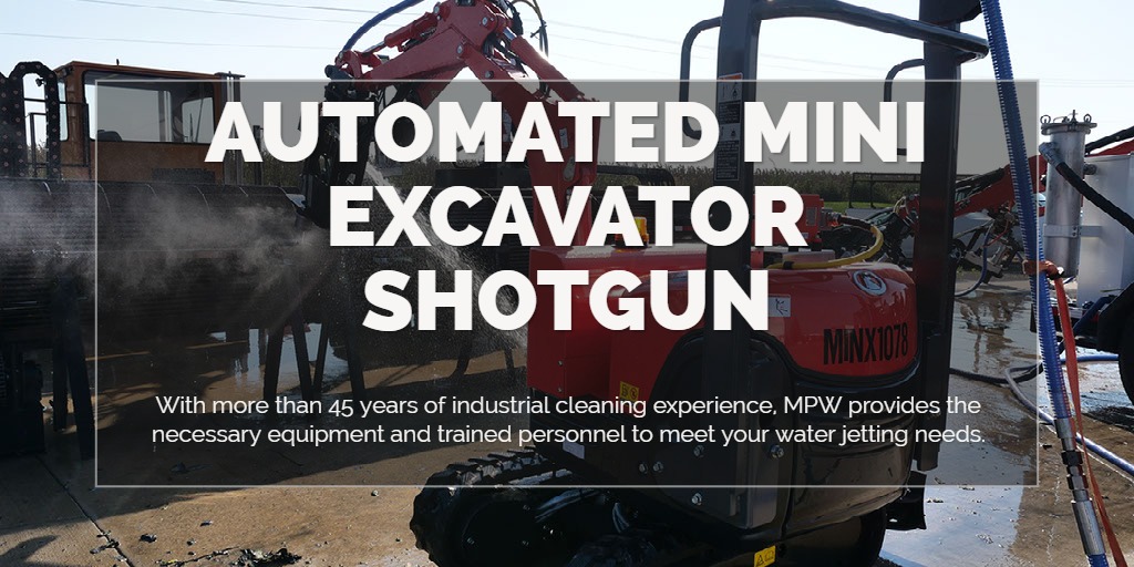 MPW’s Automated Mini Excavator Shotgun offers an automated solution for water jetting and surface preparation. The system features a remote operated control box that allows an operator to position and engage the water jet controls.