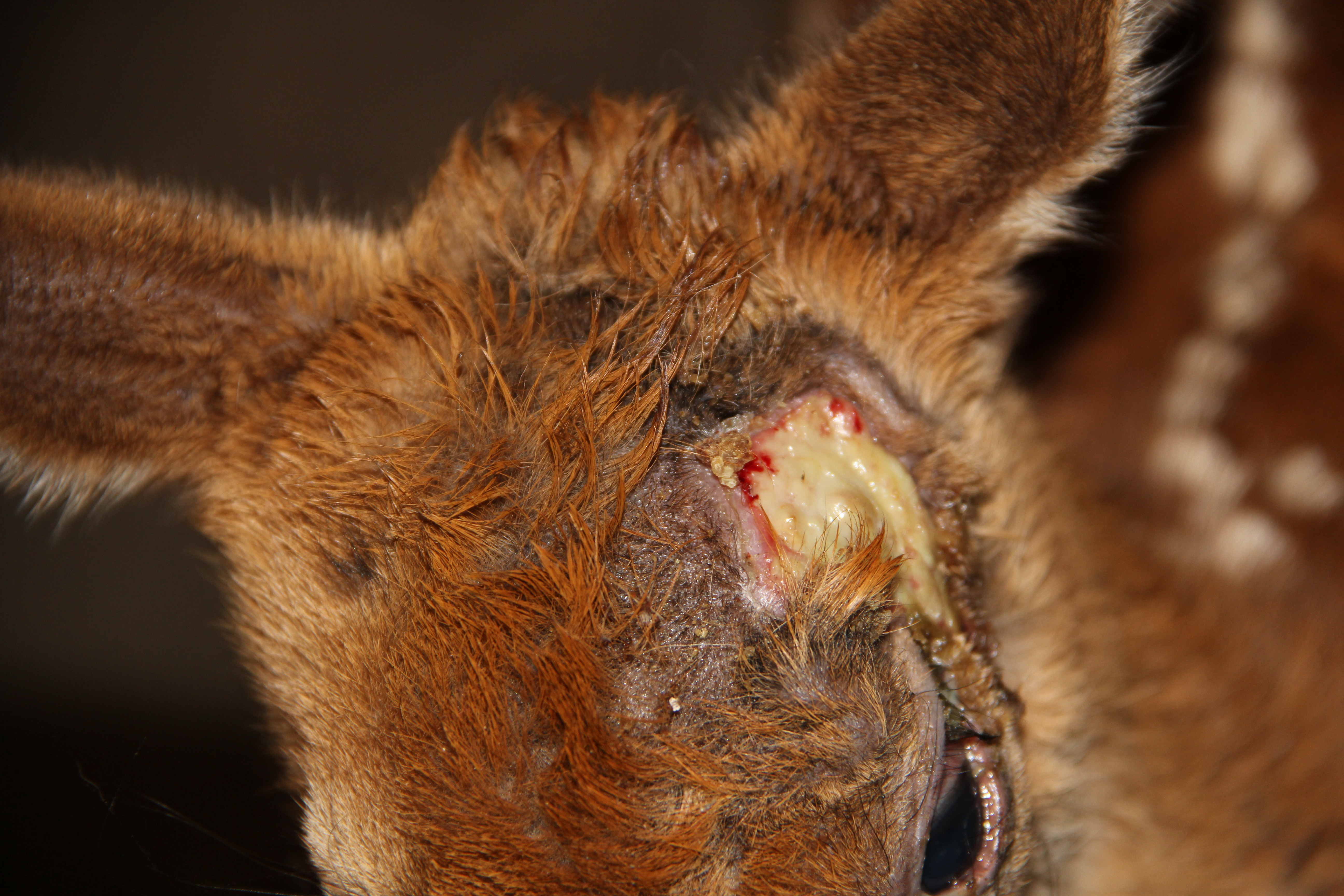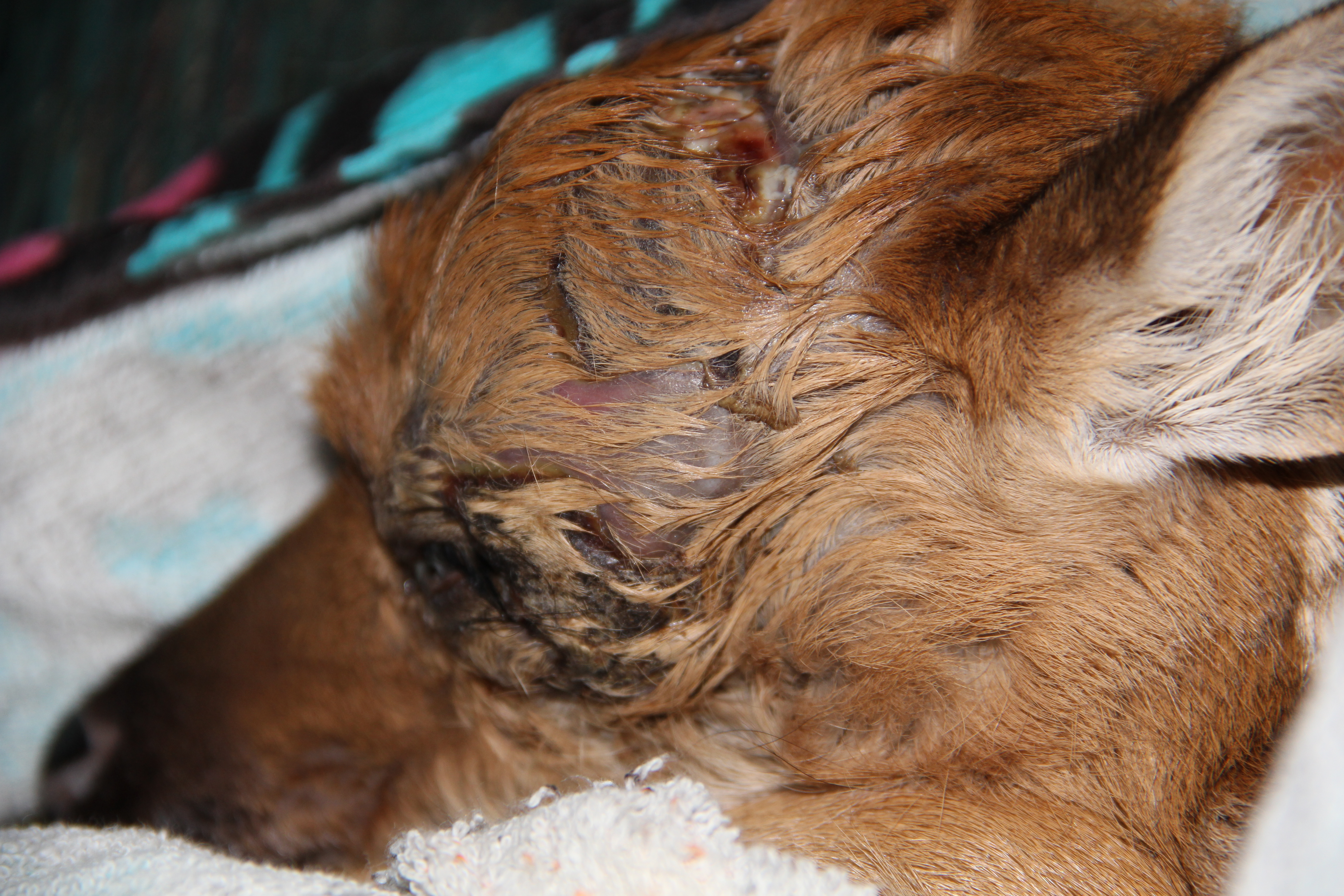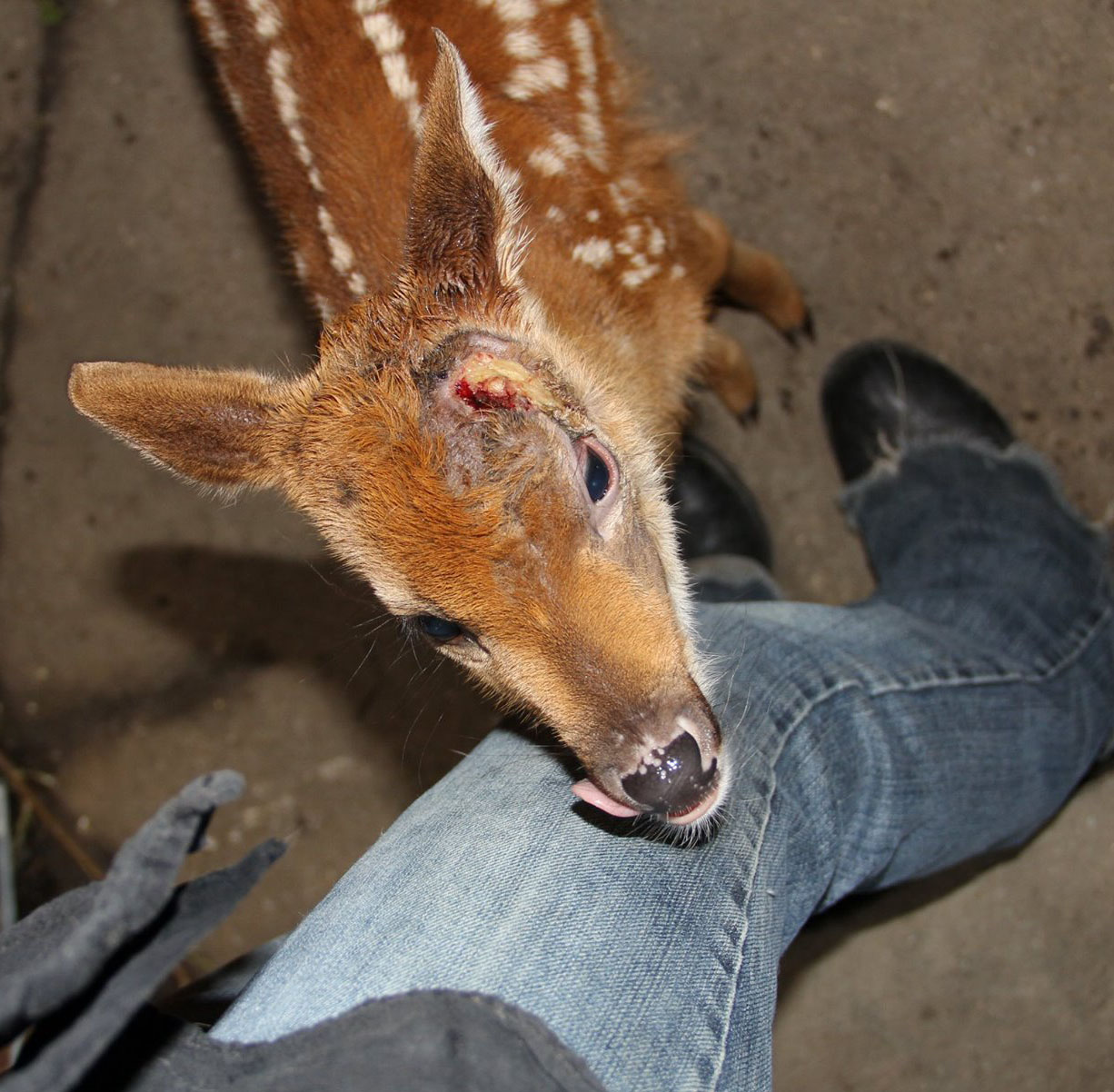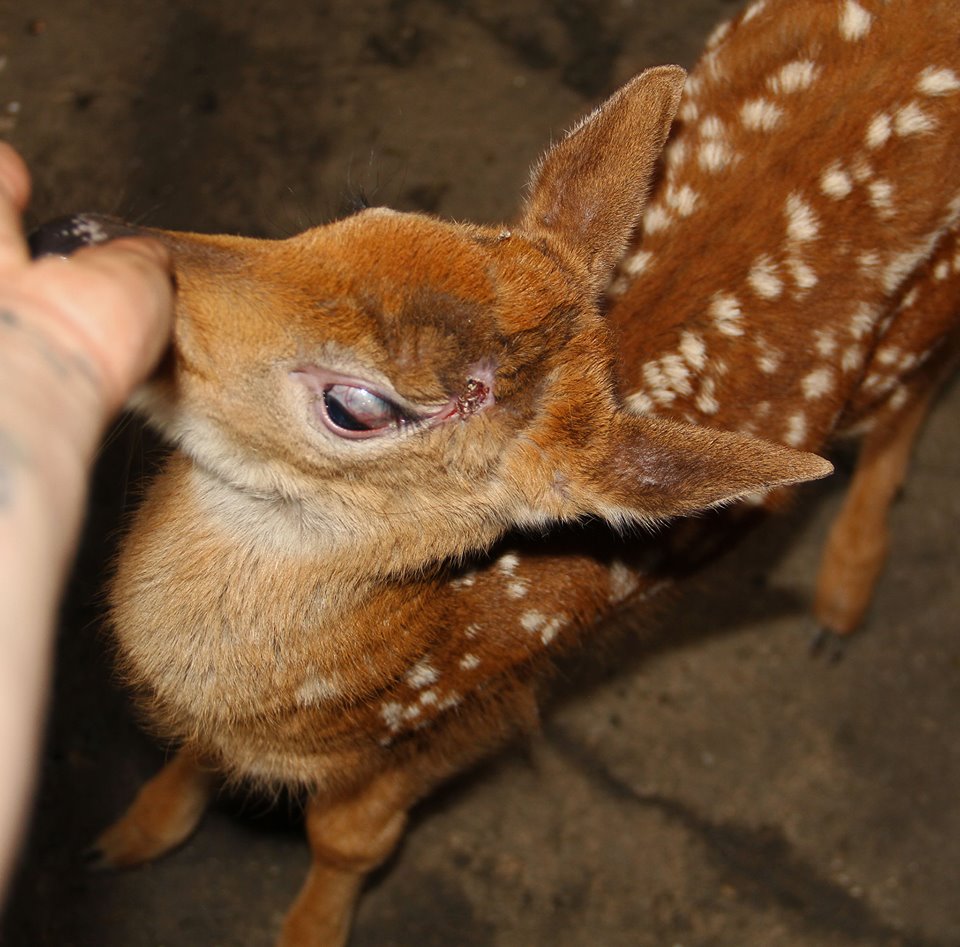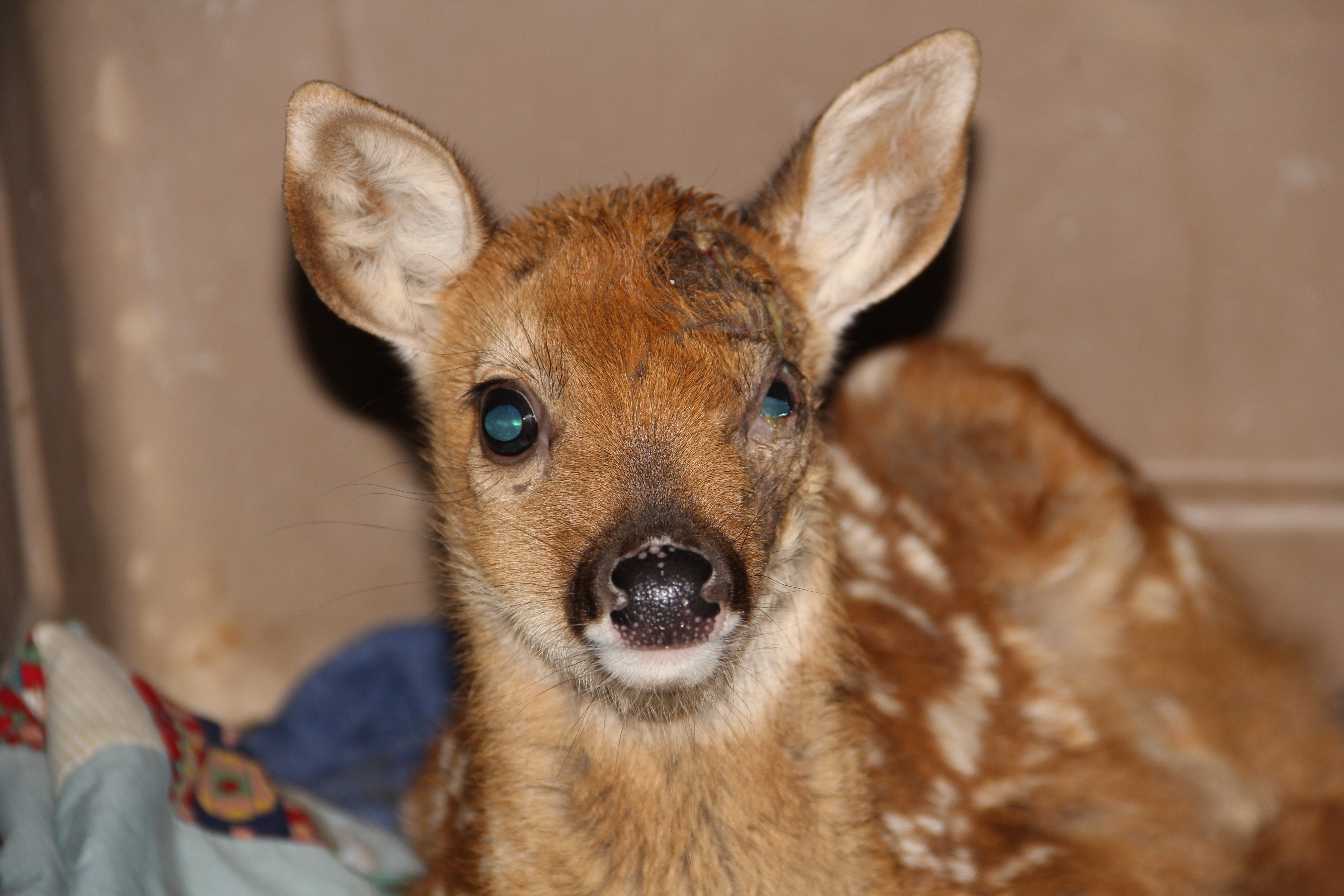 A newborn fawn, whom we named, "Stinky," was found brutally injured on the side of a road next to his deceased mother. His mom had been tragically hit by a vehicle, causing his spontaneous birth. A good samaritan passer-by found "Stinky" and took him home. A short time later, the DNR was contacted and they brought him over to us (Wildthunder Wildlife & Animal Rehabilitation and Sanctuary) " Wildthunder W.A.R.S. " for evaluation and treatment. At the time of his arrival, "Stinky" had severe diarrhea - from being fed calf replacer formula, he had extensive head trauma and facial fractures. He smelled horribly of necrotic tissues and had maggots crawling through his fur. The awful stench that came from this little guy was how he earned his unique name, "Stinky!"