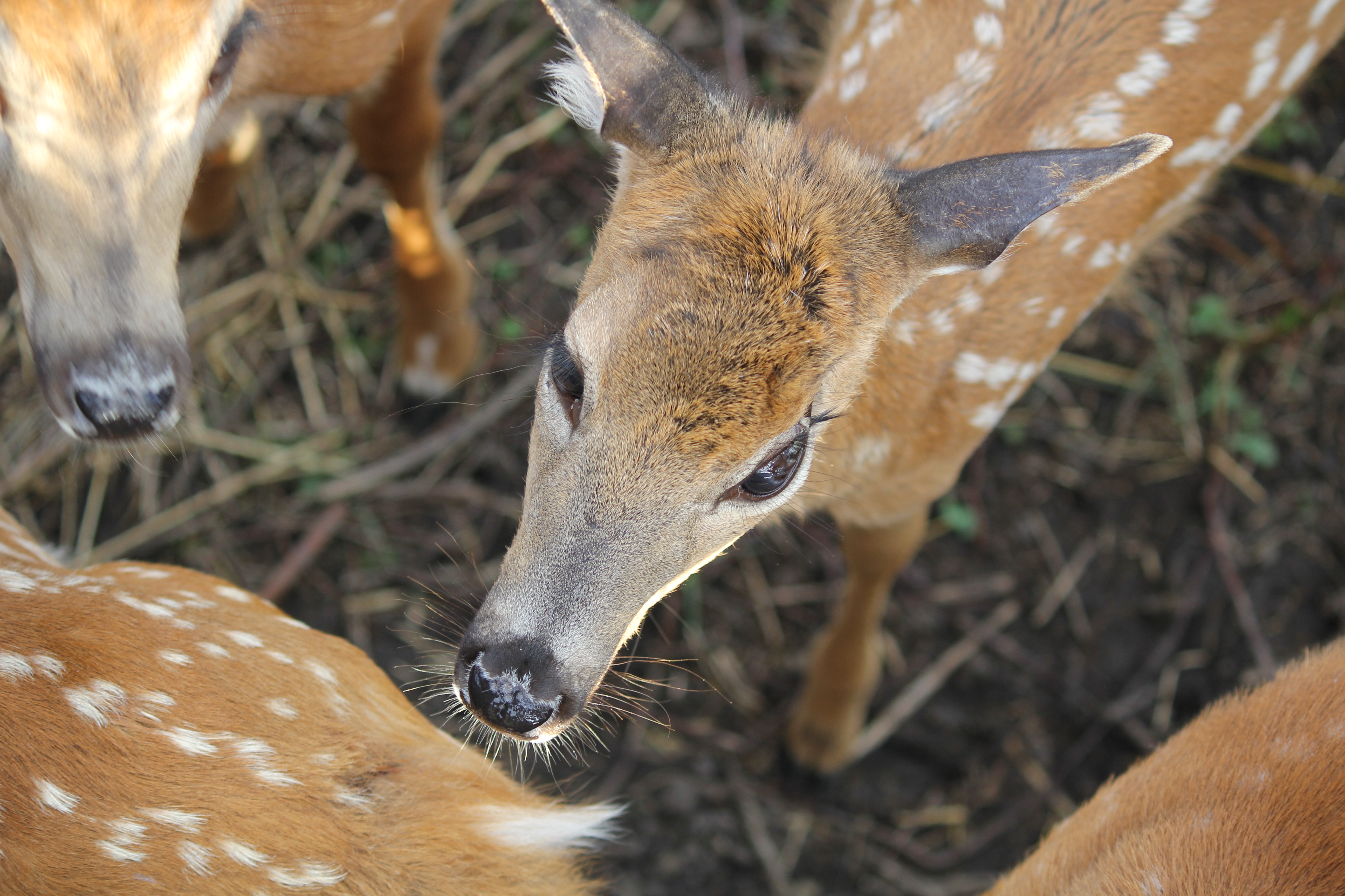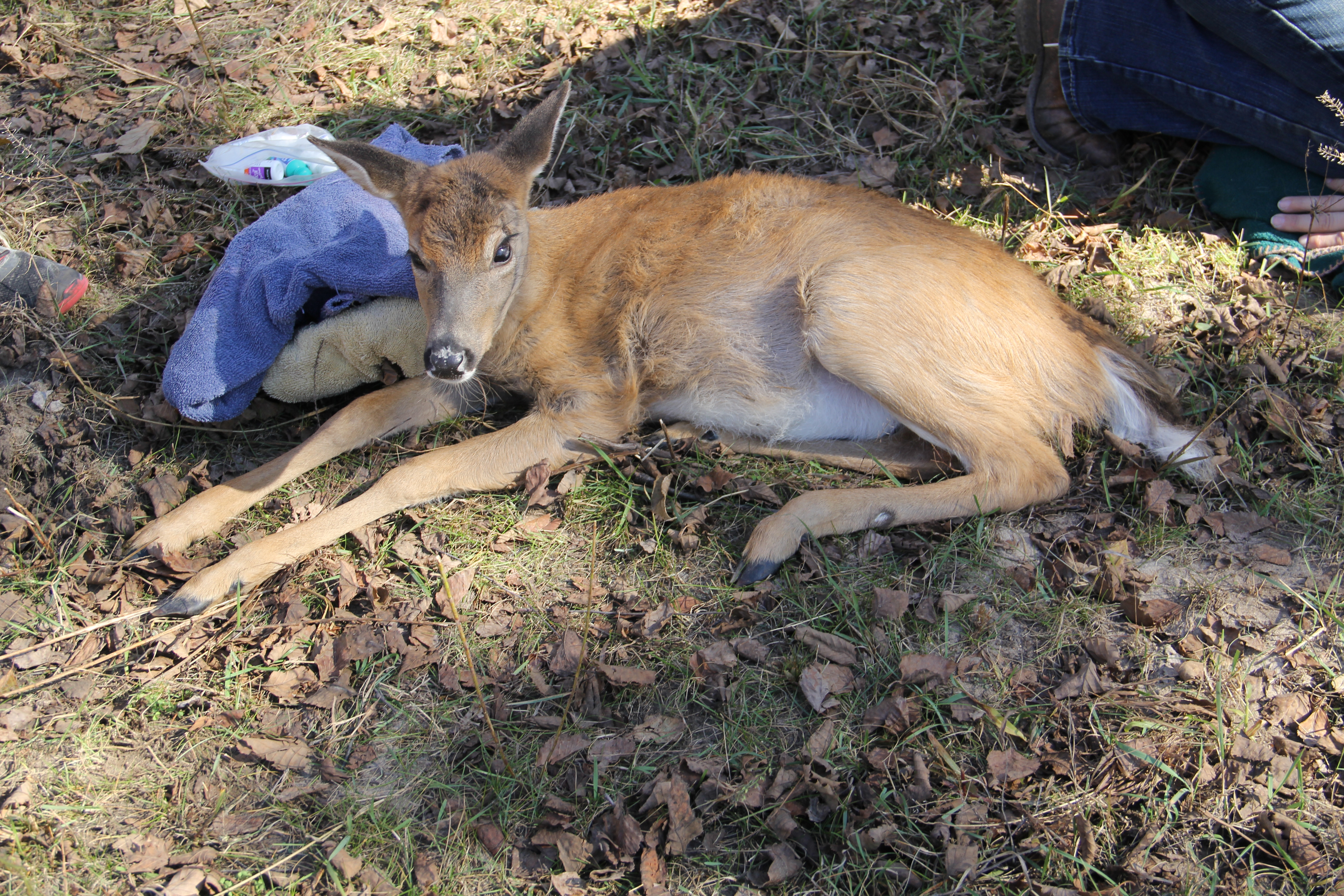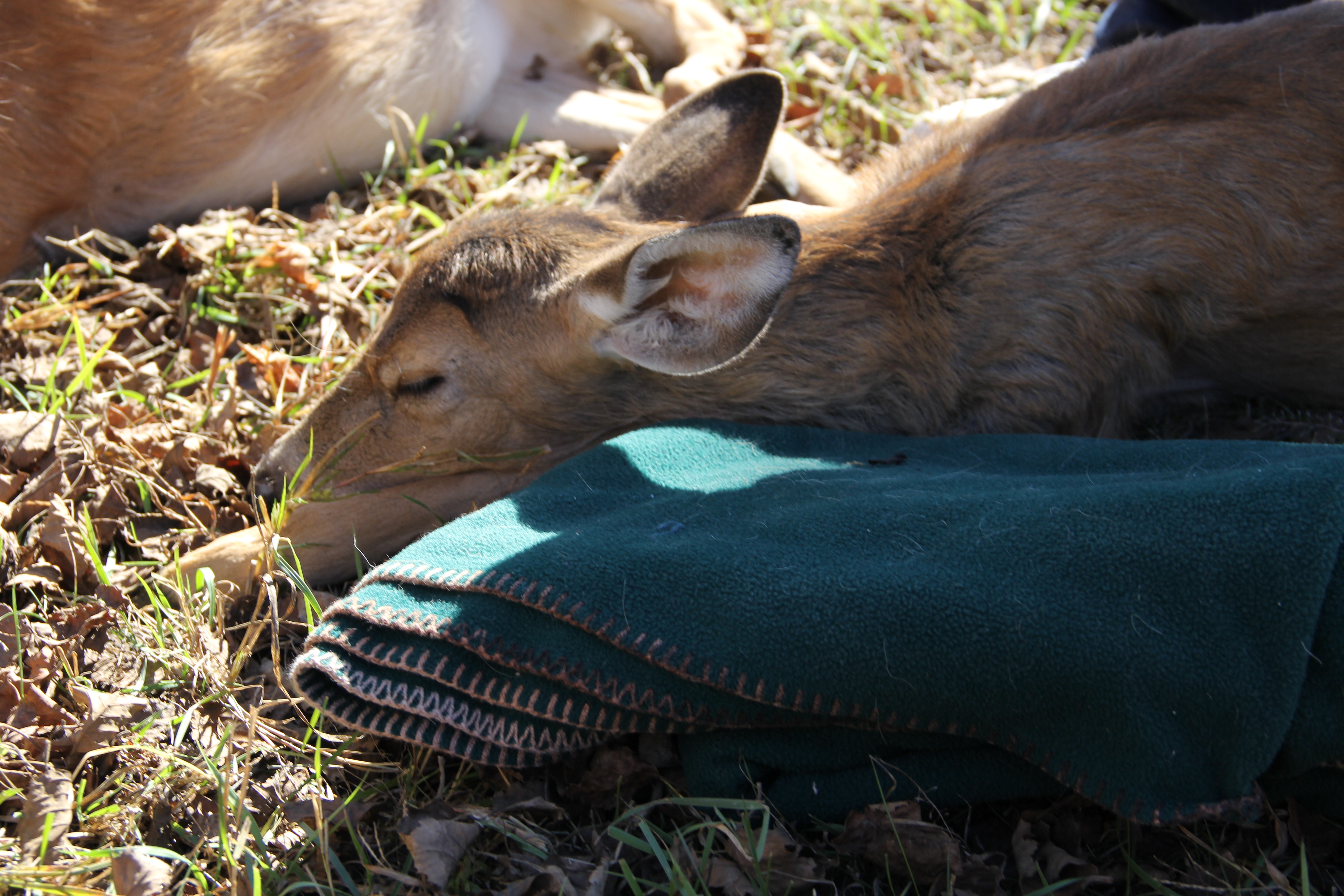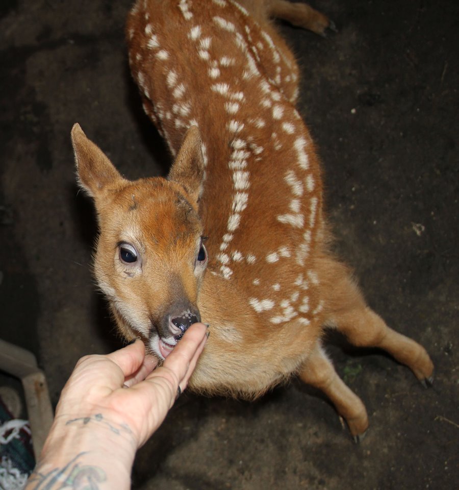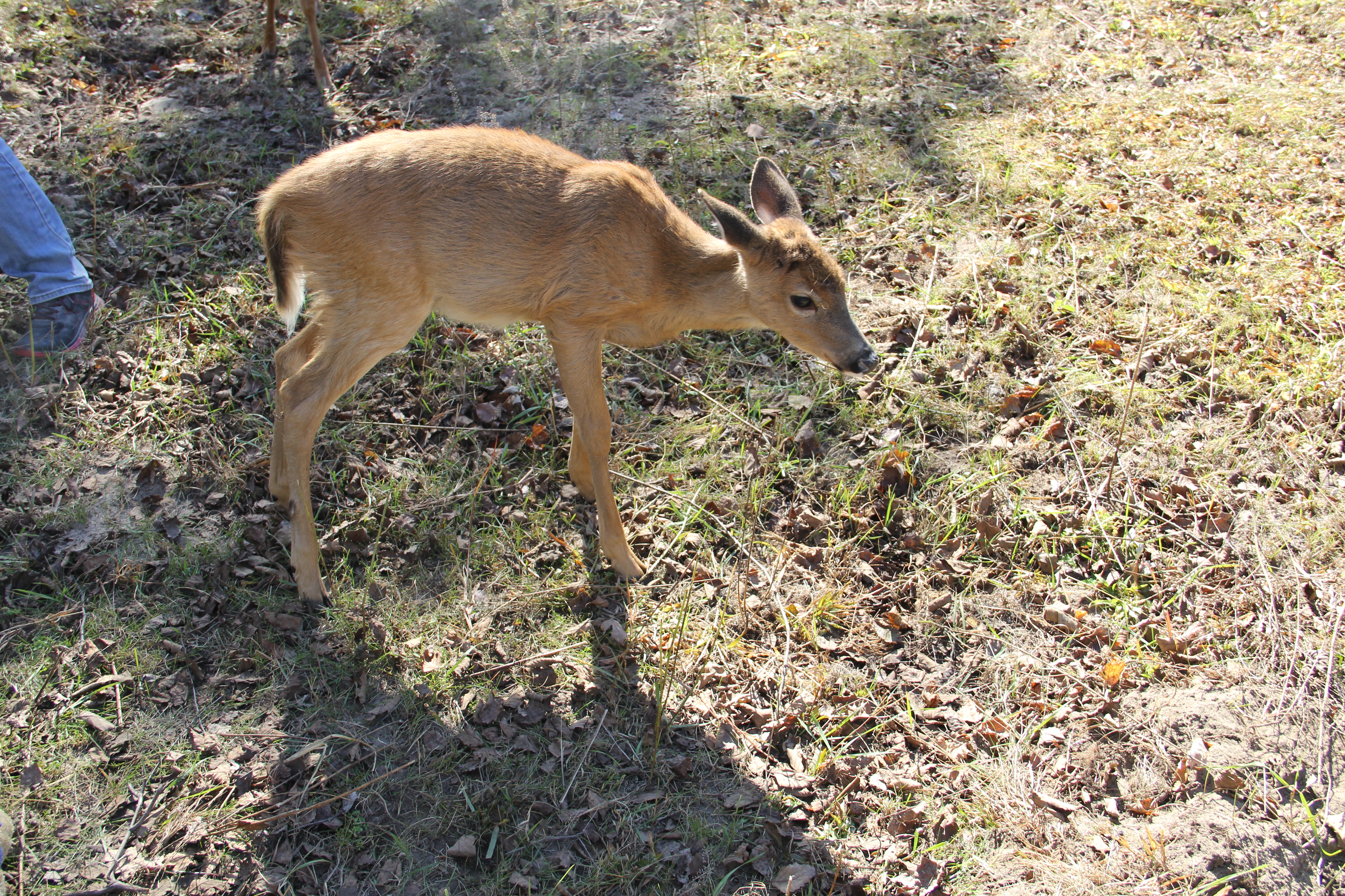 A newborn fawn, whom we named, "Stinky," was found brutally injured on the side of a road next to his deceased mother. His mom had been tragically hit by a vehicle, causing his spontaneous birth. A good samaritan passer-by found "Stinky" and took him home. A short time later, the DNR was contacted and they brought him over to us (Wildthunder Wildlife & Animal Rehabilitation and Sanctuary) " Wildthunder W.A.R.S. " for evaluation and treatment. At the time of his arrival, "Stinky" had severe diarrhea - from being fed calf replacer formula, he had extensive head trauma and facial fractures. He smelled horribly of necrotic tissues and had maggots crawling through his fur. The awful stench that came from this little guy was how he earned his unique name, "Stinky!"