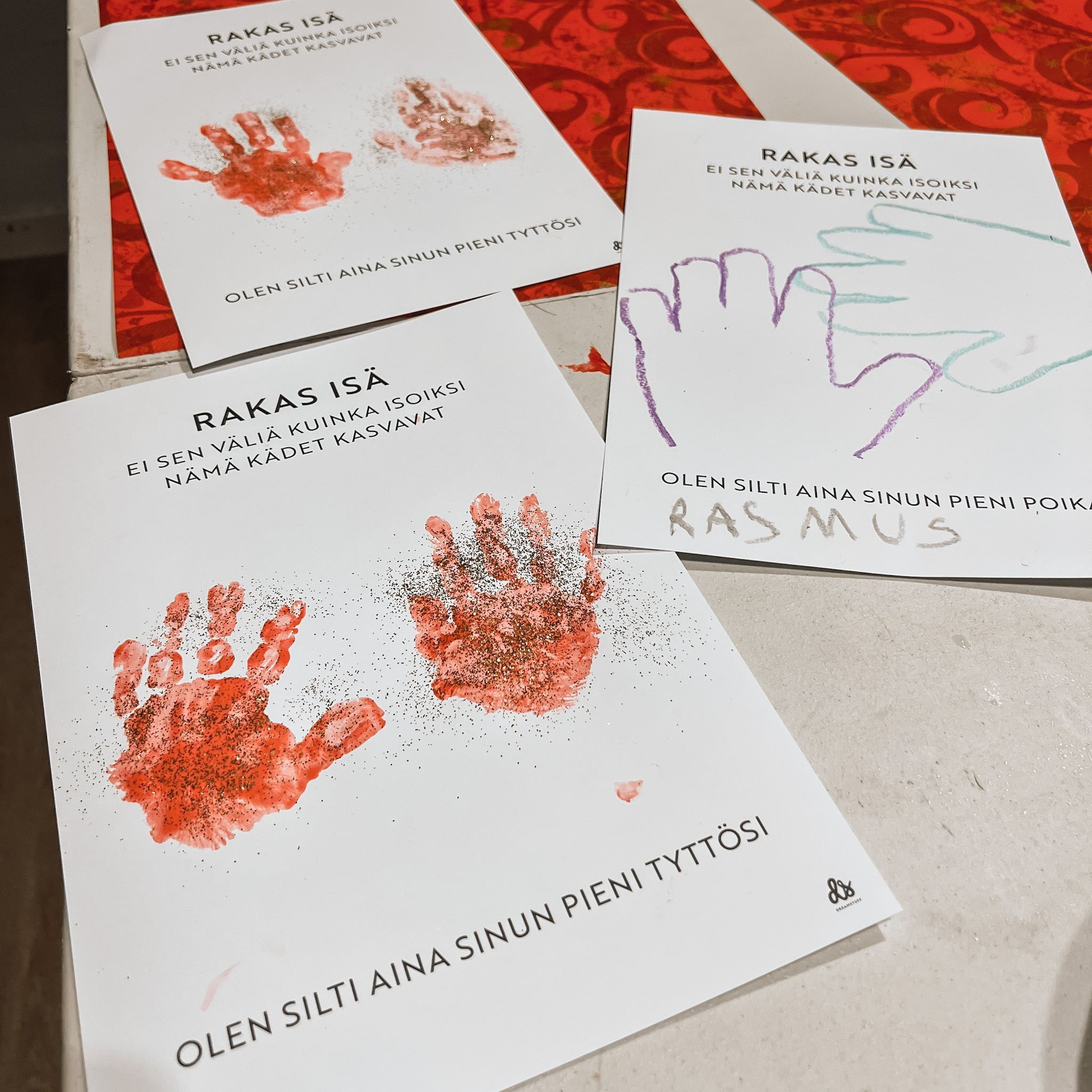 Tule askartelemaan isälle ihana Dreamstuff ”Rakas isä -juliste”. Pajalla voit painaa lapsen kädenjäljet sormiväreillä, mustikalla tai piirtää käden ääriviivat liiduilla ja koristella glitterillä!