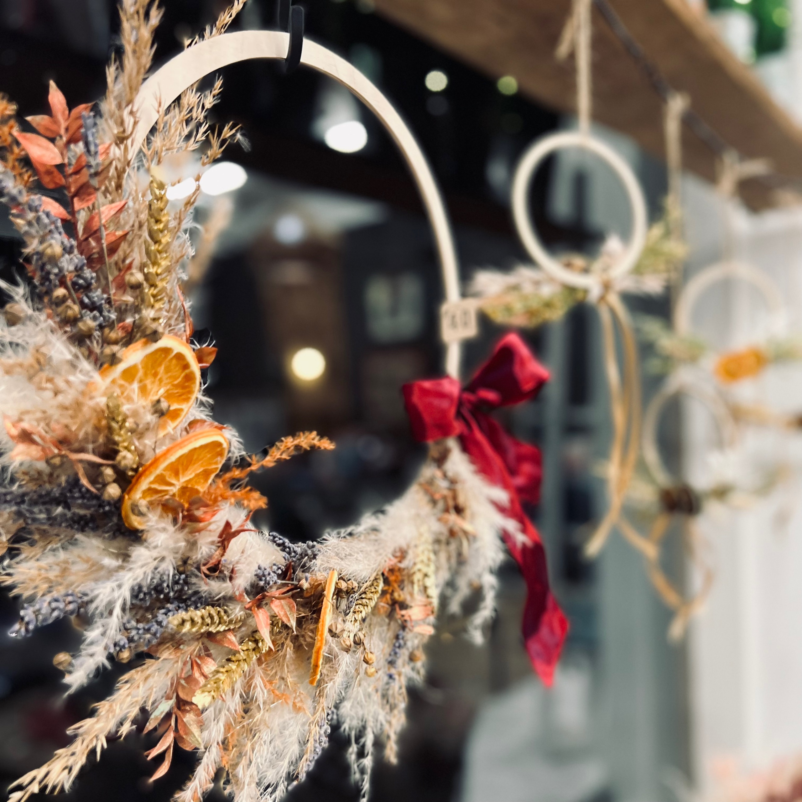 Kukkatehdas tuo joulupuotiin kauniit ja kestävät kranssit, DIY-kranssipakkaukset, kuivakukkakimput, joulupallot ja muut kukkaisat koristeet.