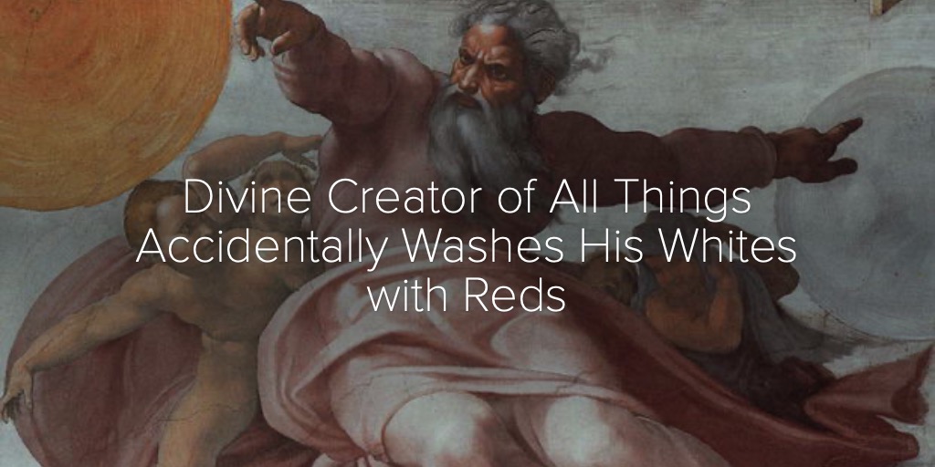“Well… shit,” said the dejected architect of time and space as he removed his now pink laundry. “I need these for my 3:30 meeting with the rest of the Holy Trinity. I can’t go in looking like this. Maybe I can scrub it out with some bleach.”