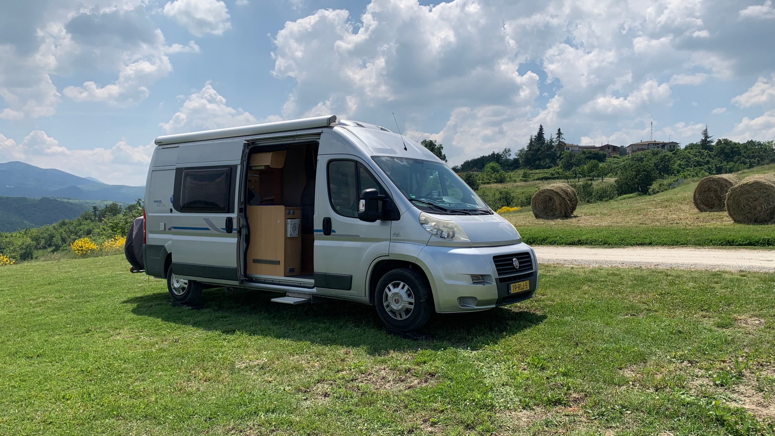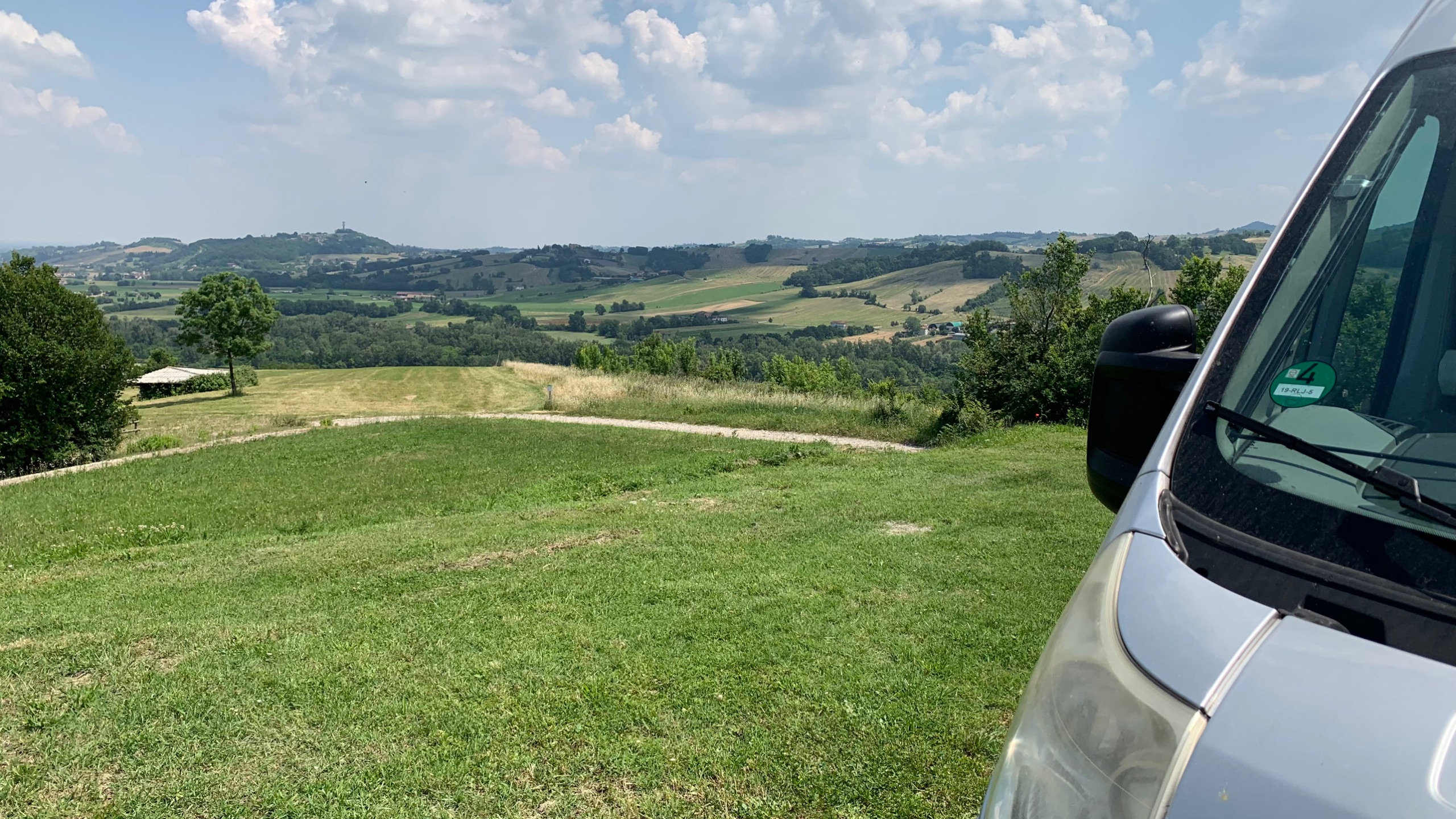 Als we vroeg wegrijden genieten we van de bergen om ons heen. Daarna komen we al snel in de drukte van Lugano en Como terecht. Maar daar kunnen we nog aardig doorrijden. Bij Milaan doemt een flinke file op, daar nemen we een afslag om die te omzeilen en even ergens een pauze-plek te vinden. Qua tijd heeft het, denk ik, niet veel opgeleverd. We komen aan op een mooi plekje van Agricamper Italië in Vigoleno. Schitterend uitzicht en een heerlijk zonnetje. Klinkt als ‘vakantie’ 😁.
