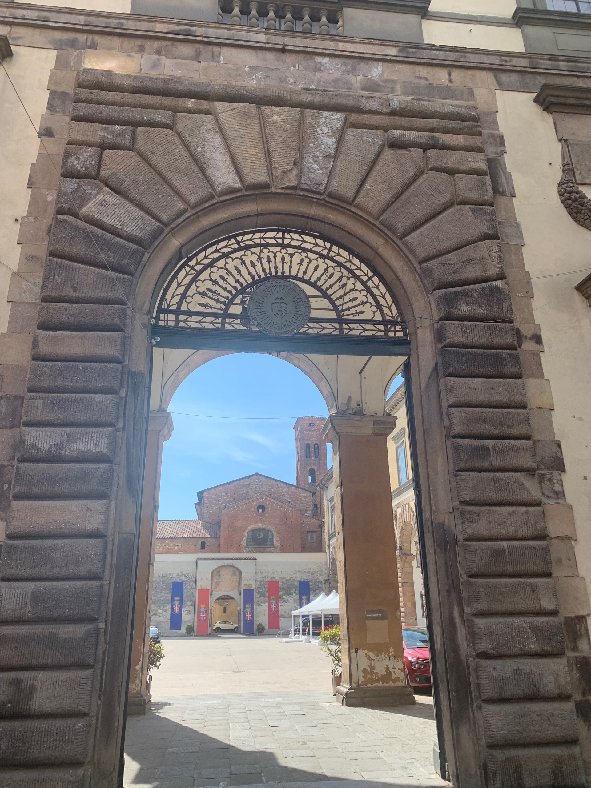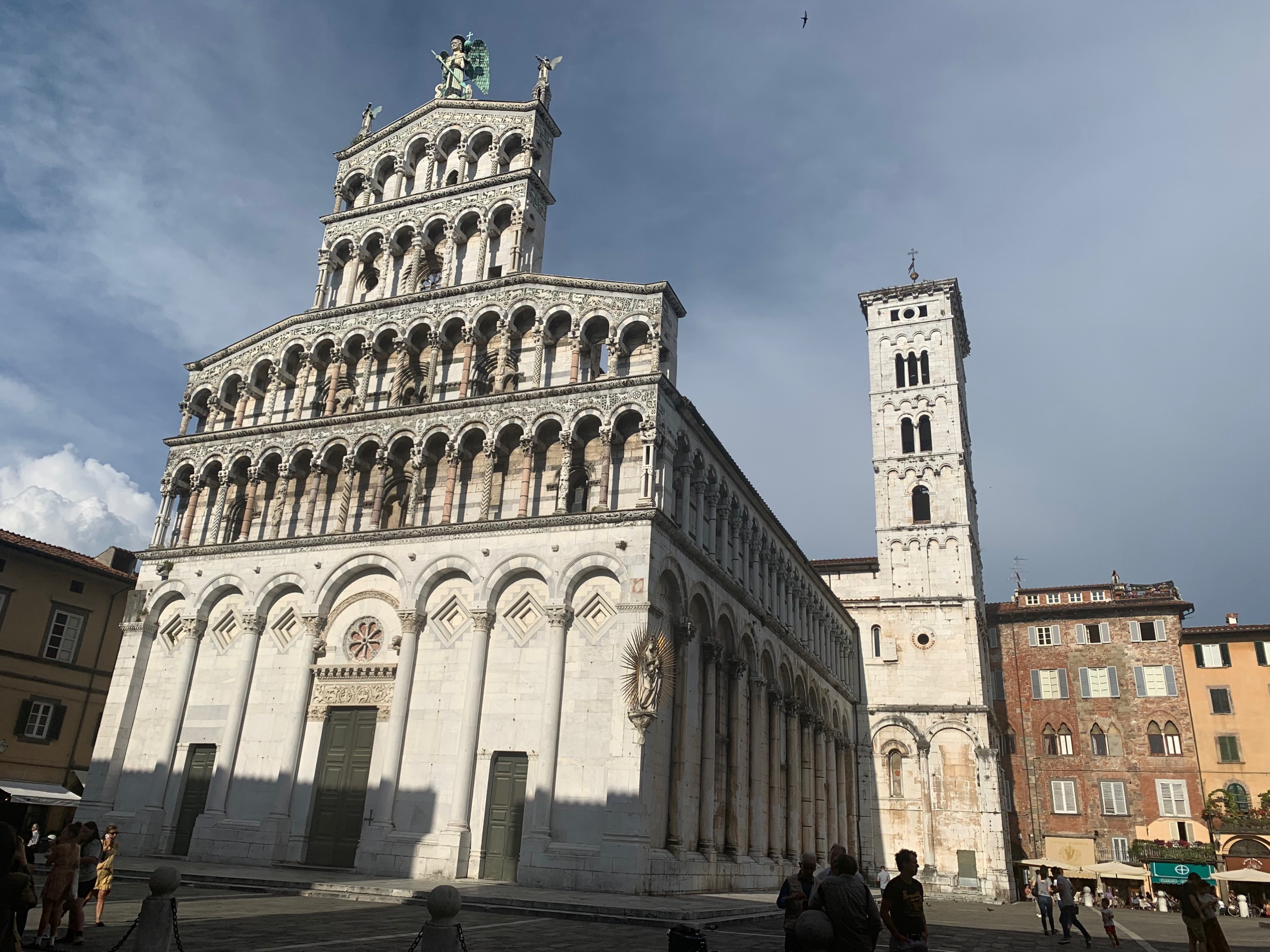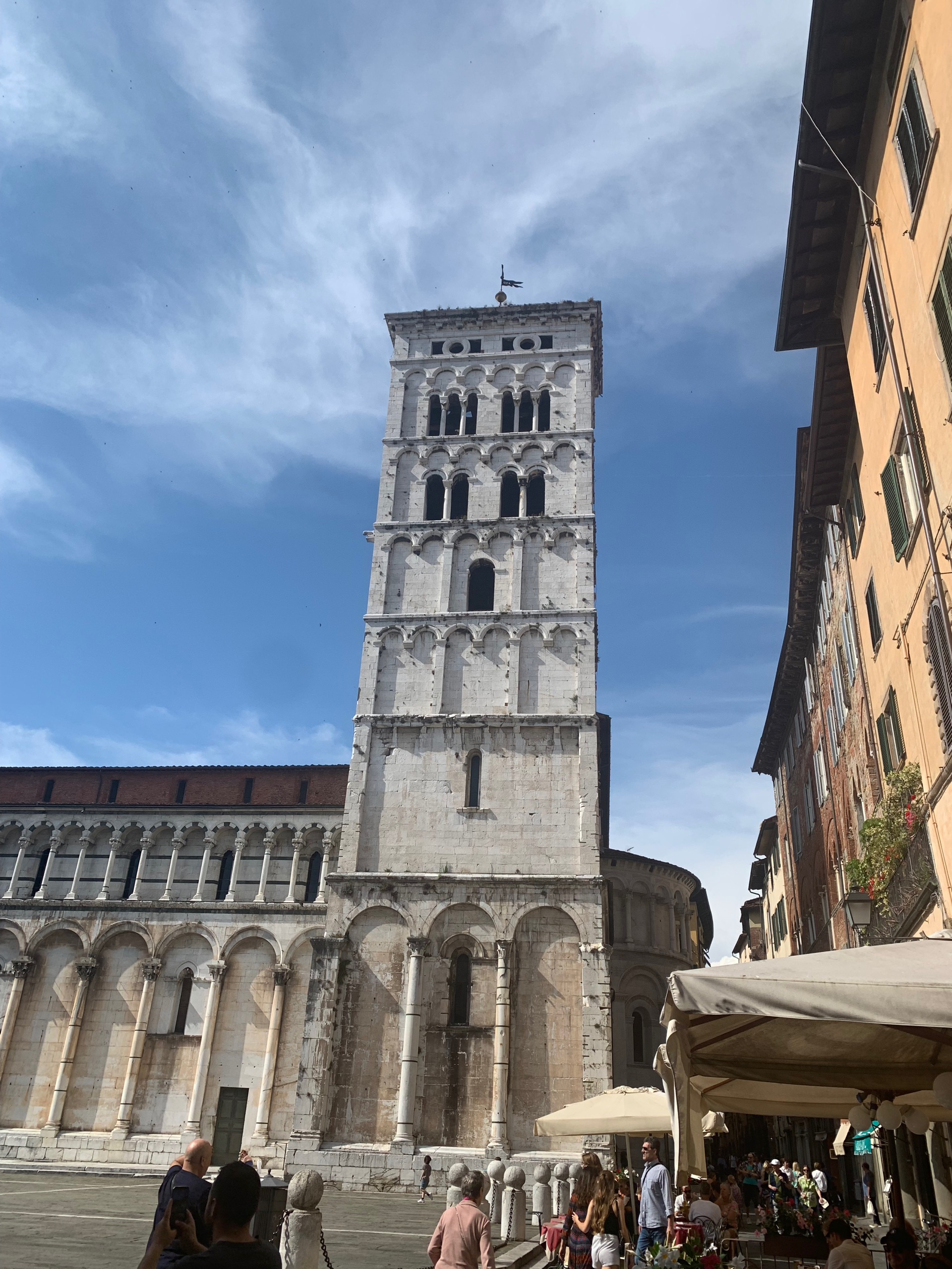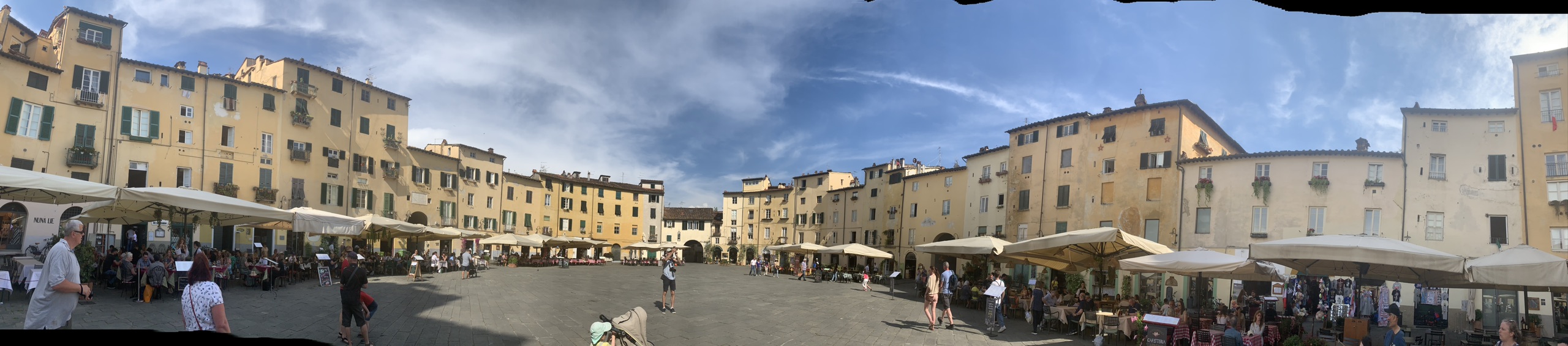 We gaan op de fiets naar Lucca. Je kunt ook helemaal langs het aquaduct rijden. Het is een gezellige drukte daar. We lopen door de straatjes en komen ook op het plein van het amfitheater.