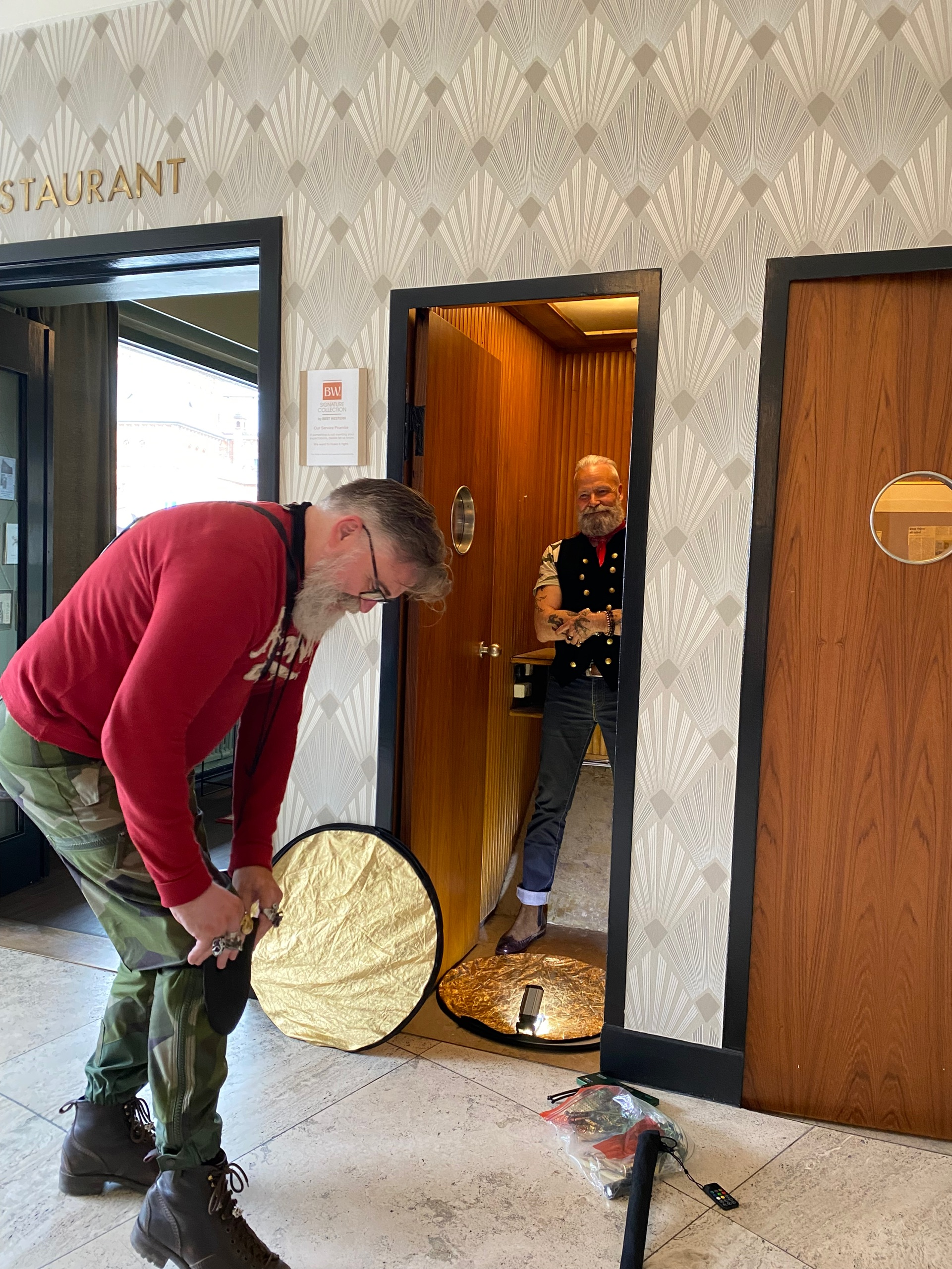 Foruden Gaffa-tapen til lys (indvendig i svingdøren) og reflektor/diffuser til lysstyring, så er knæbeskyttere er en praktisk ting, når der skal vinkles det perfekte skud. Tak til Laura Kathrine Garde Thansky for ‘Behind the Scenes’-skud.