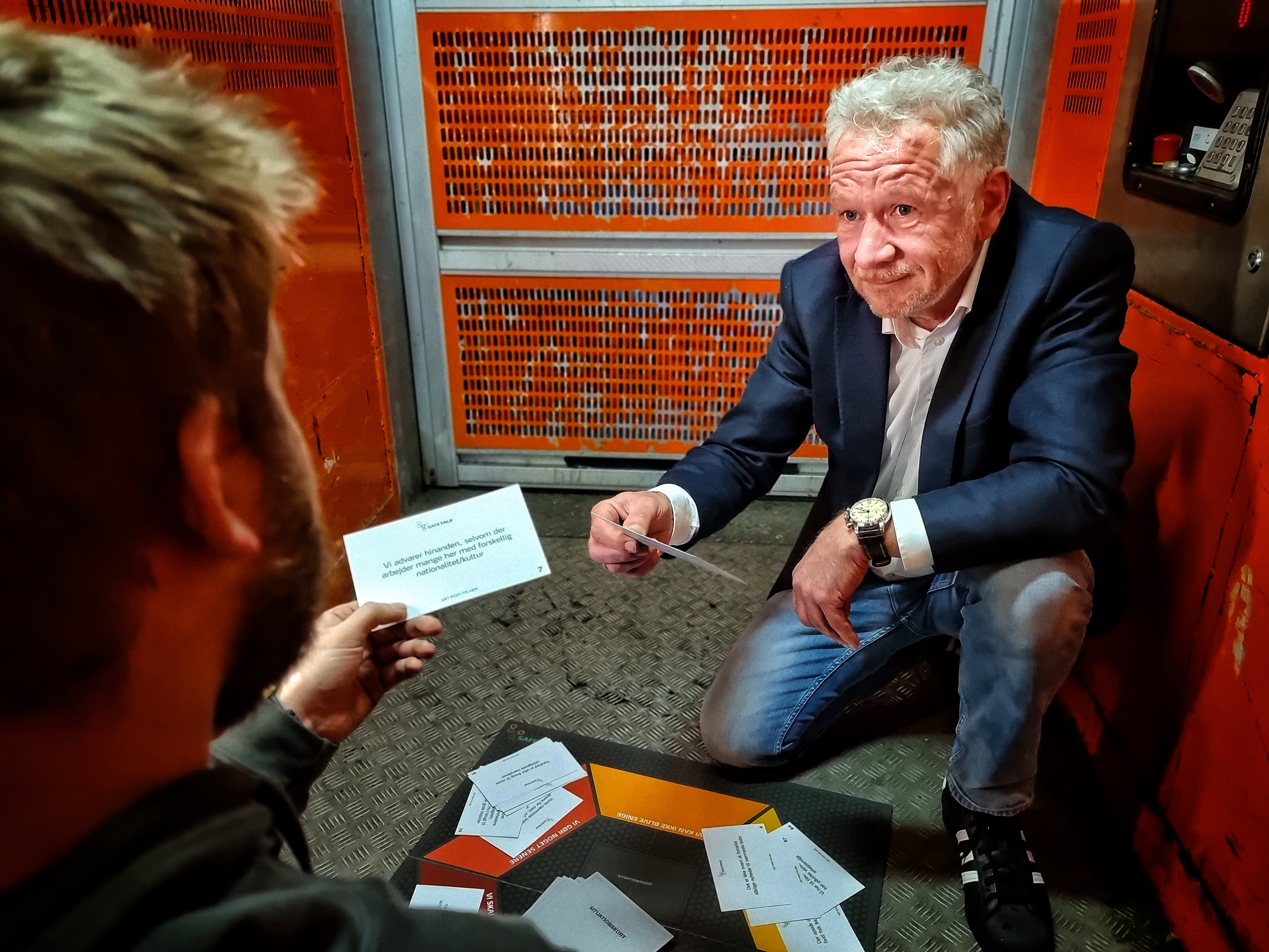 Søren Bøge, sikkerhedsrådgiver. På en arbejdsplads i 50 meters højde, med sit rådgivningsspil, SAFE-TALK og som profilbillede til sociale medier.