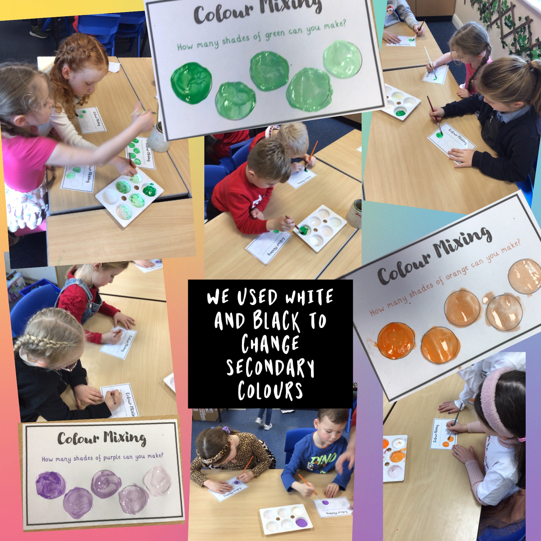 We investigated what happened when we added black or white to our colours. We then used what we had learnt to create different shades.