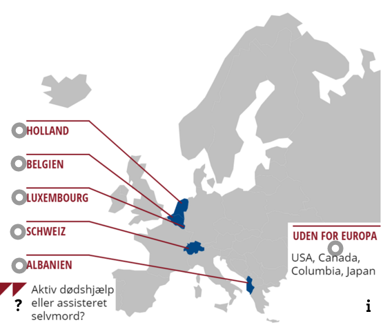 - Aktiv dødshjælp er lovligt i blandt andet Holland, Belgien, Luxemborg, Albanien, USA, Canada, Columbia og Japan. Her er ydes det alene til uhelbredeligt syge, og det sker ved en overdosis af et stærkt lægemiddel.