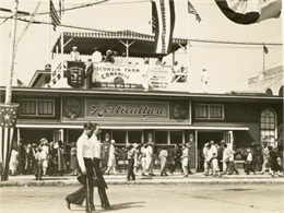 "In order to attract the public, more and more popular entertainment was added to the standard exhibits of farm machinery, displays of produce, and competitions for prizes for the best farm animals and domestic arts products. This gallery provides highlights of those changes through time, from fire company competitions, horse races, sideshows and brass bands, to auto and motorcycle races, aeronautics shows, demolition derbies, politicians and TV/movie celebrities, Alice in Dairy land and, of course, food and amusement rides."