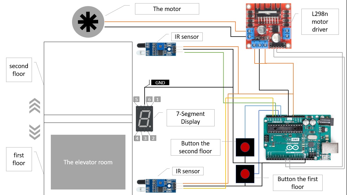 The target of the experiment is to make an elevator that works on two floors that is controlled through the Arduino in two ways, either through the buttons, or manually wirelessly through the IOT application