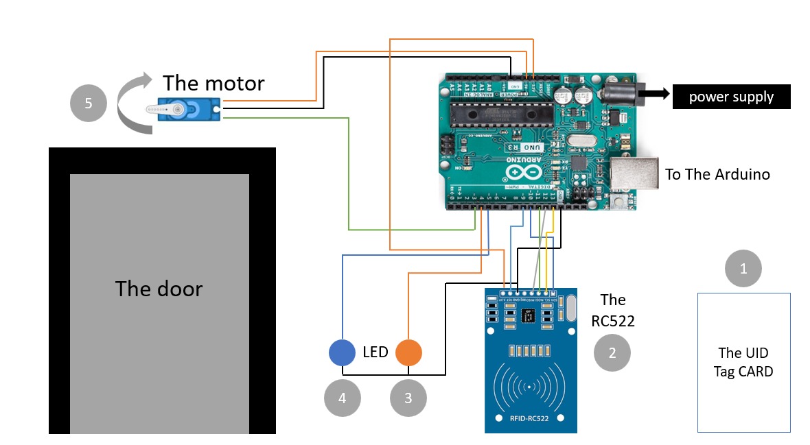 The second problem is the traditional way to open and close the doors using the keys in this system. Each user in the house can use one UID card to open and close any door inside the house. It is also possible to use the mobile phone as a key instead of the normal key or open the door for anyone through the application in the event of The absence of the user inside the house or closing the door in case the user left the house and forgot to lock the door