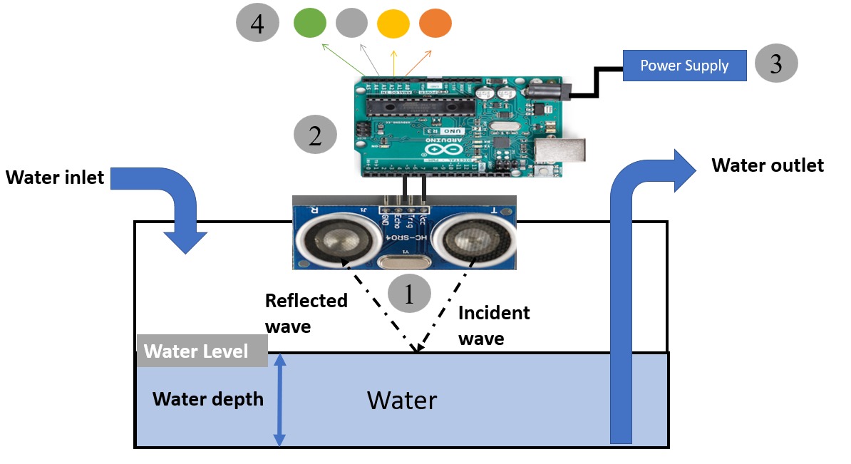The water level monitoring and control differ from one application to another The determination of the water level is the first step of mater flow control. This includes mechanical and electronic circuit utilization. The experiment in this project uses an ultrasonic wave sensor to specify the water level where lamps indicators are used to inform the percentage of water inside the water tank