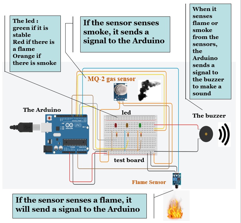 fire alarm systems are quite popular, they usually include a cluster of sensors that continually monitor any building flame, gas, smoke, or fire and cause an alarm if they detect them. One of the easiest ways to detect fire, gas, and smoke is by utilizing a Flame sensor and MQ 2 Gas Sensor the system starts working when the sensors detect smoke or heat after that the alarm will ring, and the lamps also start alerting.