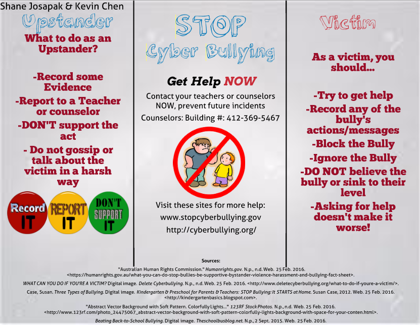 Alright, on this list, we have our top 9 project "De-escalating Cyber bullying". This project required students to create a poster, pamphlet, or a flyer. Me and my partner chose to make a pamphlet, this is the pamphlet we made and I think it is pretty dank. This project let the students to have the freedom to chose what to put on the project, which is how it made to number 9.