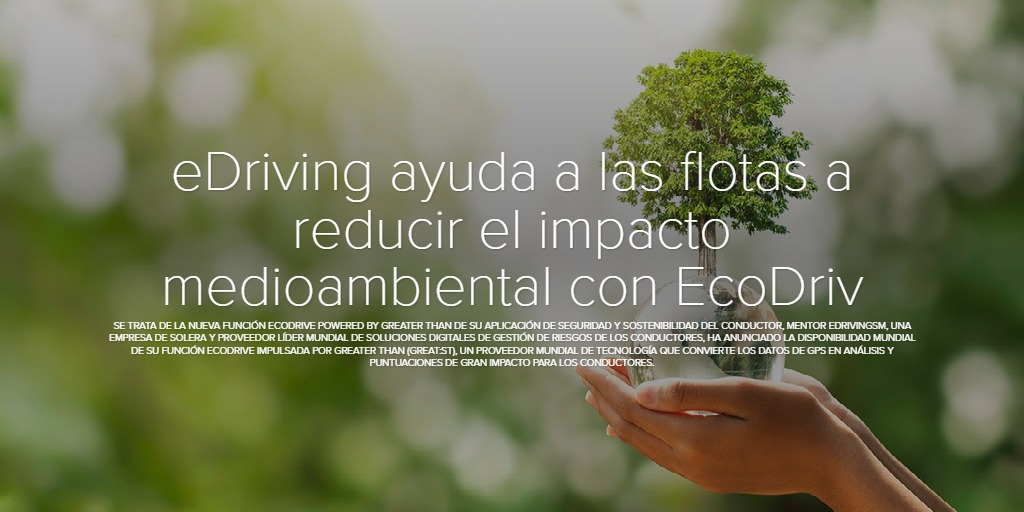 eDriving ayuda a las flotas a reducir el impacto medioambiental con EcoDriv Se trata de la nueva función EcoDrive powered by Greater Than de su aplicación de seguridad y sostenibilidad del conductor, Mentor eDrivingSM, una empresa de Solera y proveedor líder mundial de soluciones digitales de gestión de riesgos de los conductores, ha anunciado la disponibilidad mundial de su función EcoDrive impulsada por Greater Than (GREAT:ST), un proveedor mundial de tecnología que convierte los datos de GPS en análisis y puntuaciones de gran impacto para los conductores.