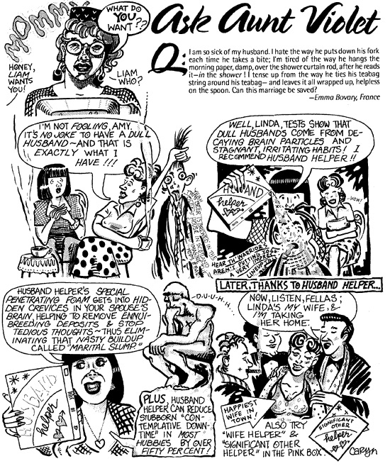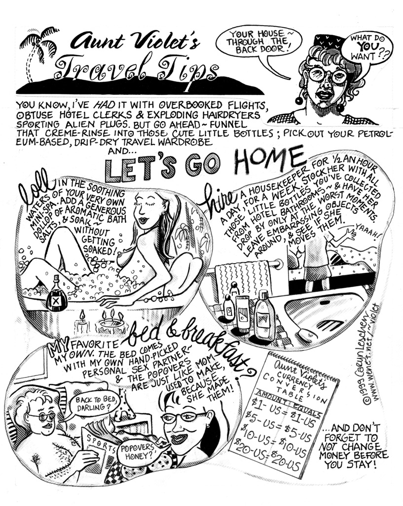 Caryn Leschen is a graduate of CCA and has been a professional illustrator, copywriter, graphic designer and cartoonist for over 20 years. She is widely known for her work in the ground-breaking comix anthologies Wimmen's Comix and Twisted Sisters. Since then, she's designed a range of websites, presentations and publications, and written acres of quirky copy and comedy for web, TV, and print. In the '90s, she created Ask Aunt Violet, an advice comic featured in alternative weeklies throughout the US and Canada, including the SF Weekly, Chicago Reader, Ottawa XPress, Madison Isthmus, and Creative Loafing. As a professor of Computer Science at USF, she teaches Adobe Animate and Illustrator, Apple Keynote and Pages, MS Word, and has established a unique workshop in Drawing on the iPad. If you want to actually laugh out loud right now, visit her neglected blogs, Rant Violet and Aunt Violet's Museum of Old Bags.