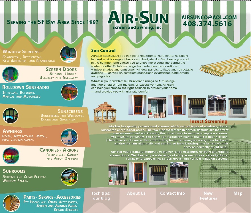 David Racionzer, of Air-Sun Screen and Awning, is the best. I loved working with him on this website, because It was really handcrafted, and I could be creative and colorful. Your experience of screens and awnings will be totally transformed here: