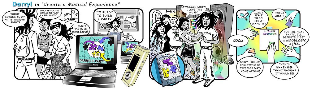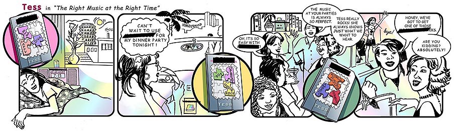 Below: About a million years ago a project visualizing, as comics, how one might live with a device that can anticipate music choices for the individual, and how to share them. Amazing! I did this kind of product visualization work with Apple, Sun and some other companies. It was fun being a part of this change on our culture — and Bill Joy from Sun even sent me a thank-you note.