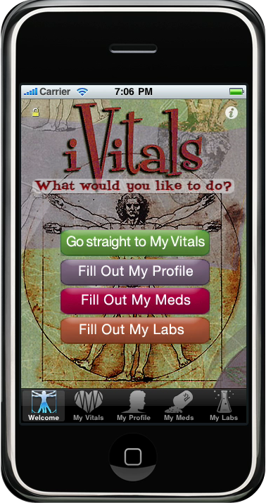 IVitals was a very robust health care app, commissioned by a cardiologist from Chicago, Dr. Thomas Hinkamp. I did all the art, icons, buttons, and copywriting. The code was written by a partner, Jean Tantra, at MetaTheory.com.
