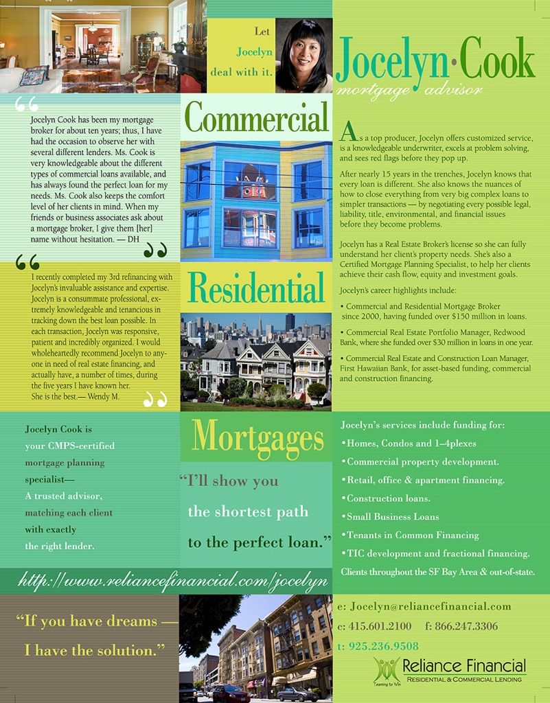 Jocelyn Cook is a Mortgage Broker. I have worked with many people in the sphere of Real Estate, creating several websites, art directing a TV infomercial, and writing literally scores of real estate bios and property descriptions.