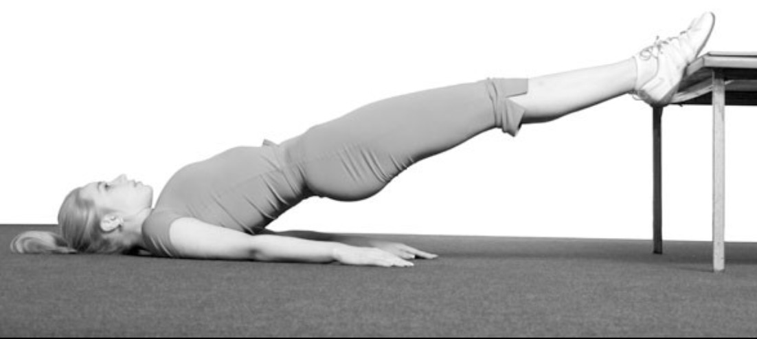 И. П. (исходное положение): лежа на спине у кровати, ноги согнуты в коленях, стопы упираются в край кровати. При желании таз можно продвинуть под кровать.