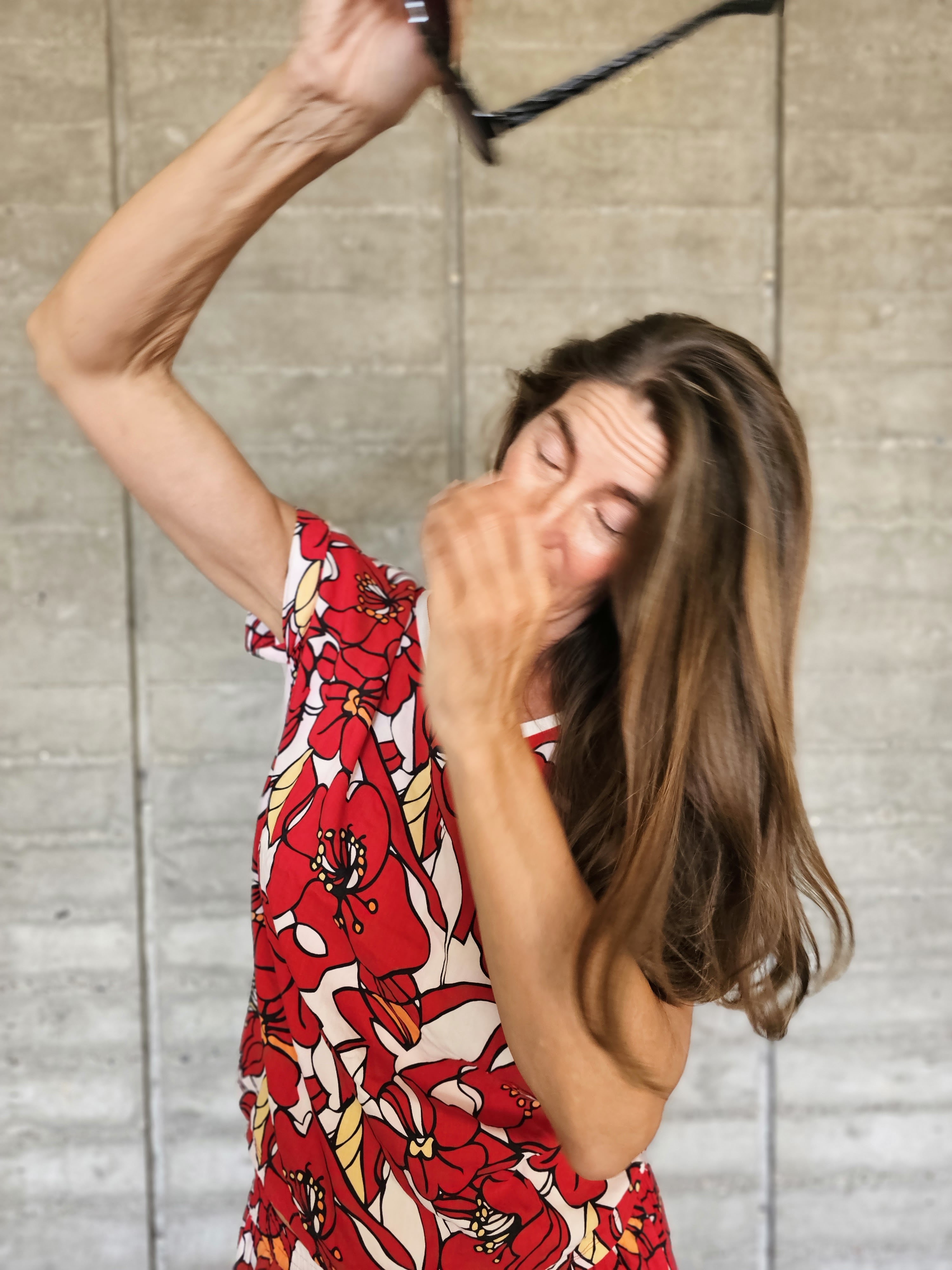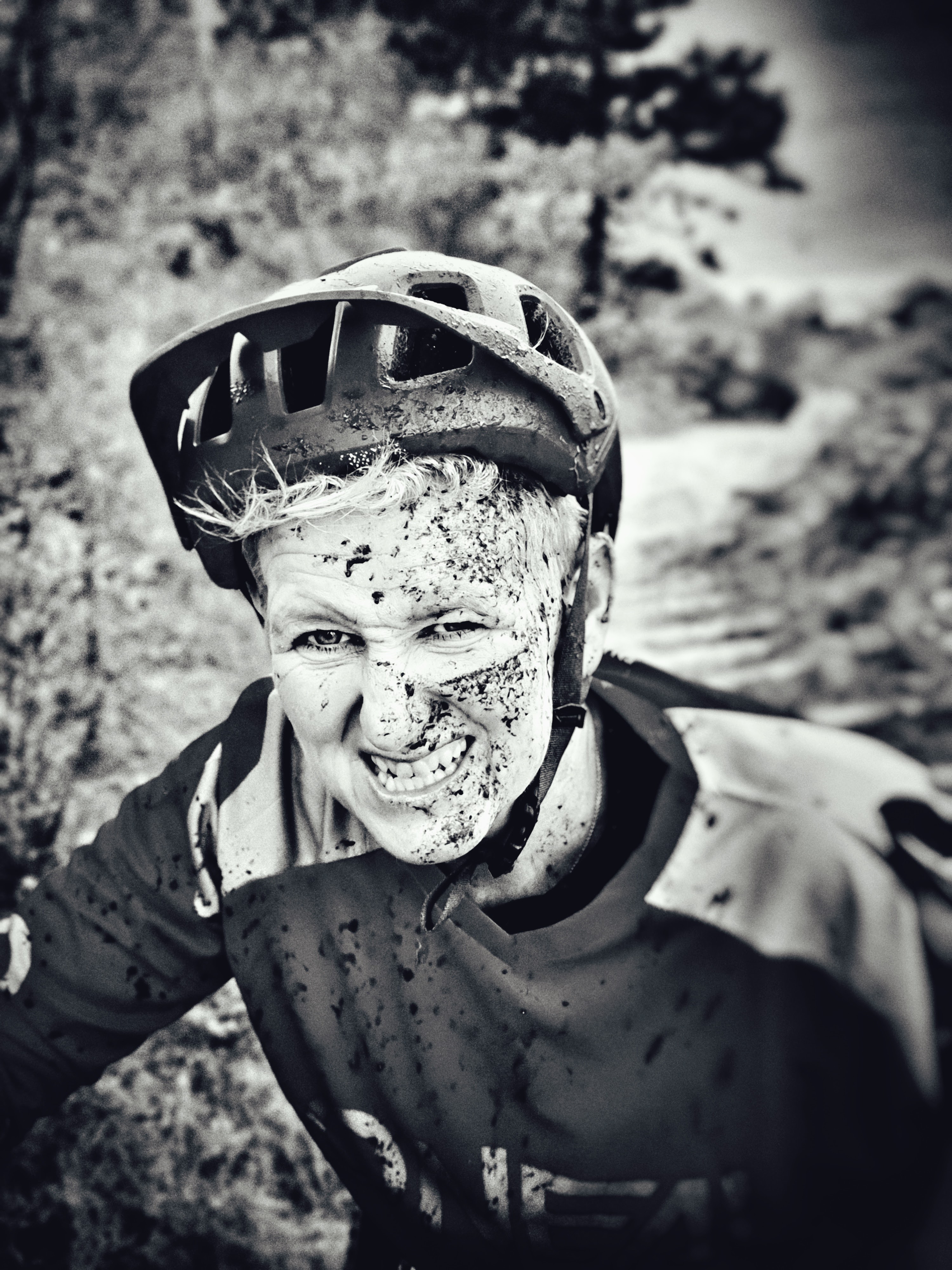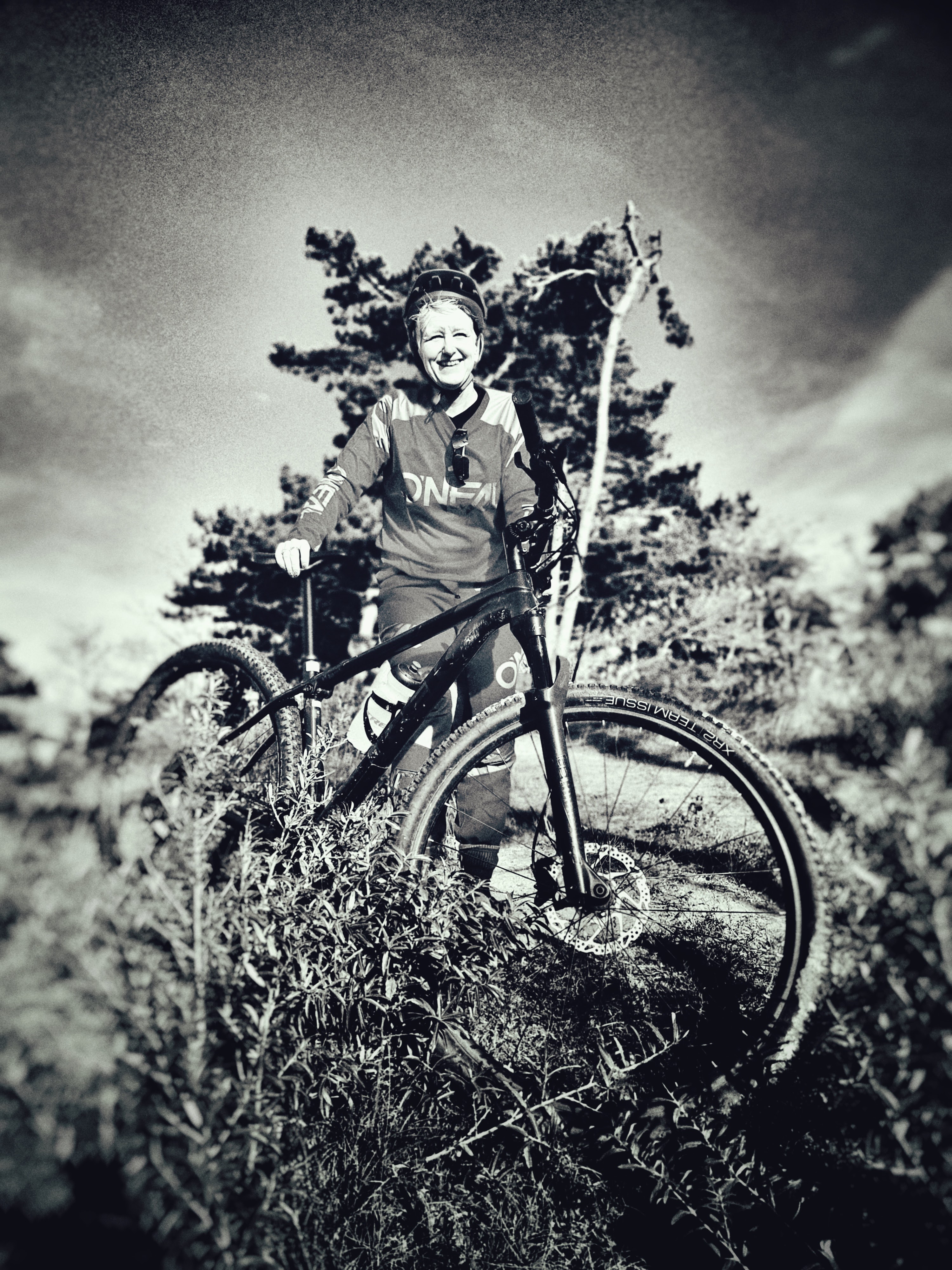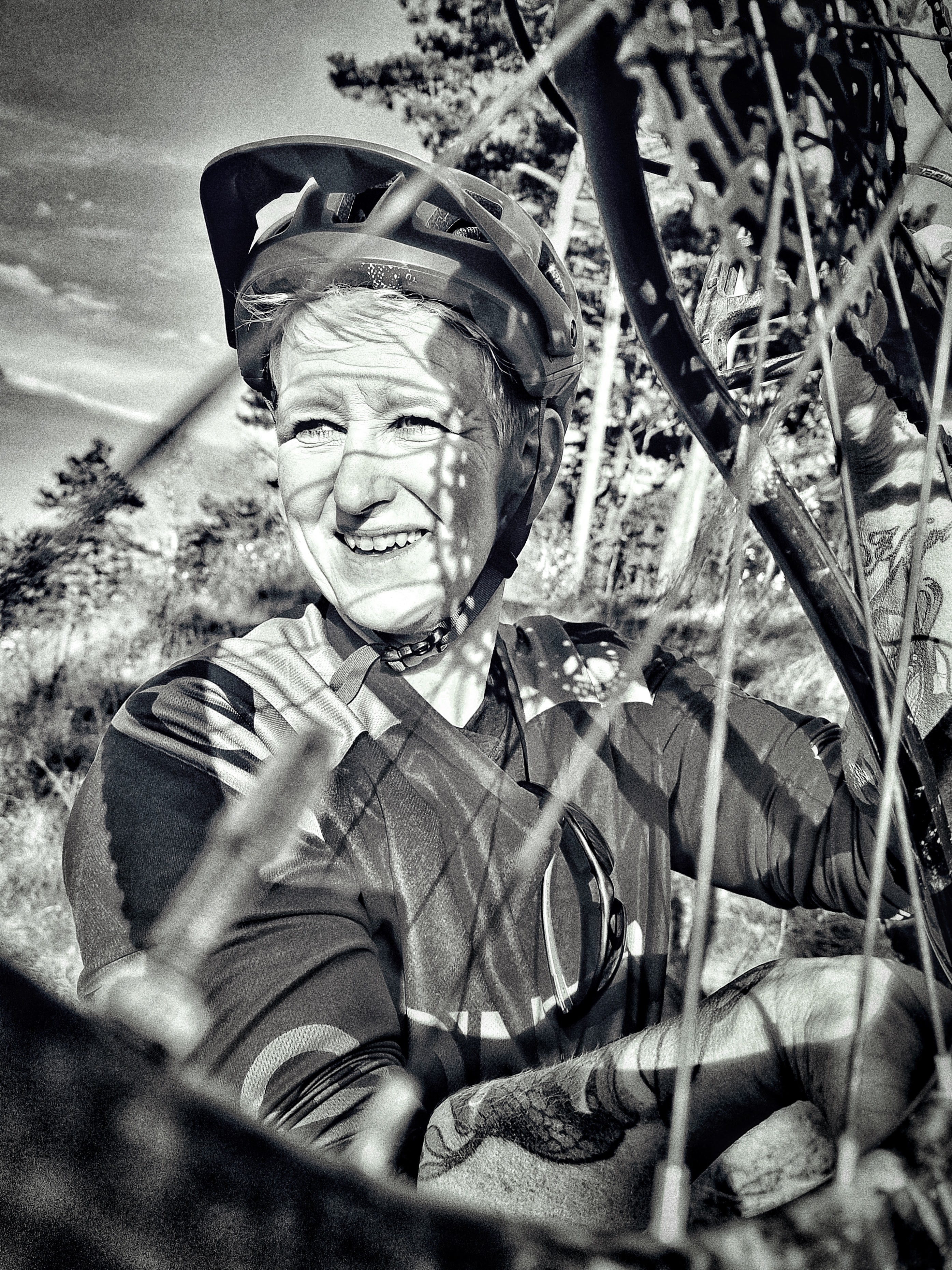Jeg mødtes med hende i det kuperede terrain i Kregme på Nordsjælland, hvor hun foruden ‘dirt track’ mountainbike-billeder også fik ramt ‘omsorg’ med sin gigant-gule gummiand (smiler) OG sin gule regnjakke OG den gule paraply, fordi: ‘gul gør mig bare glad i låget’.
