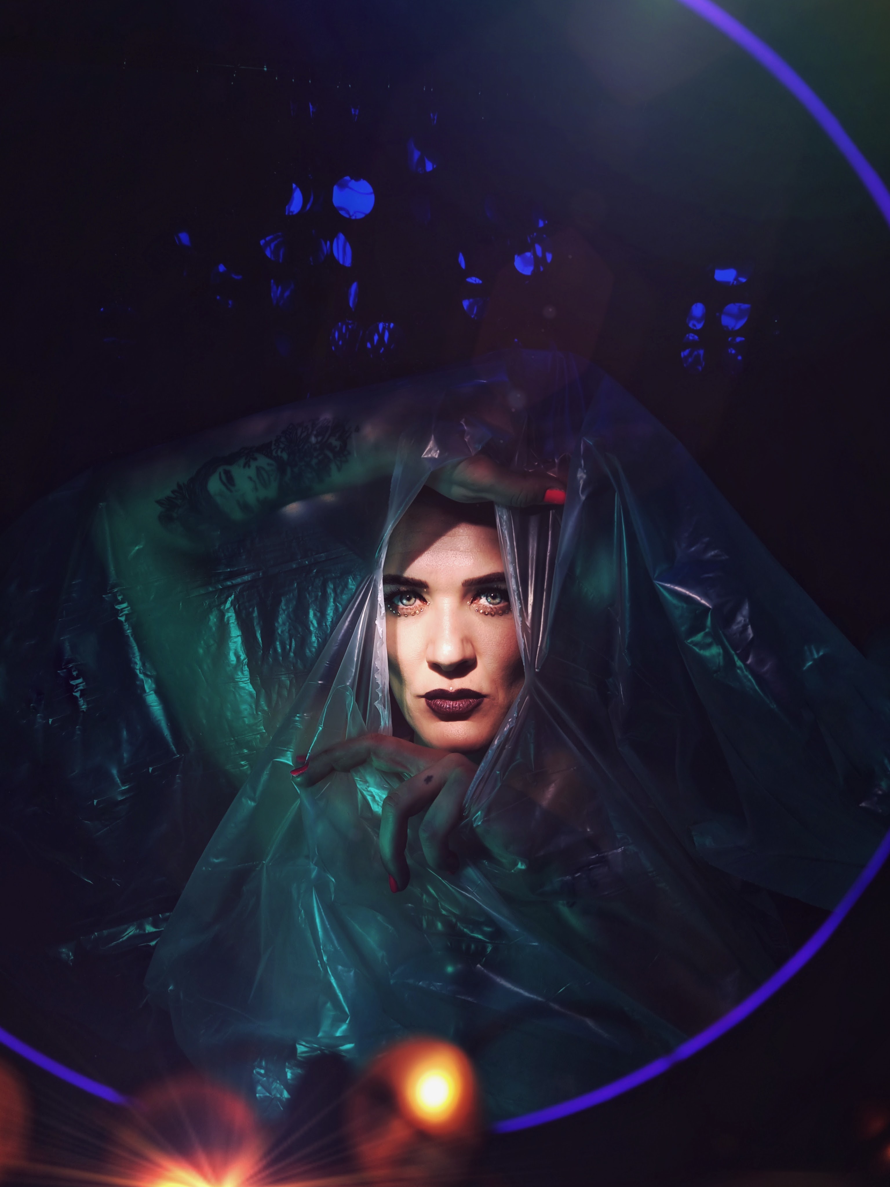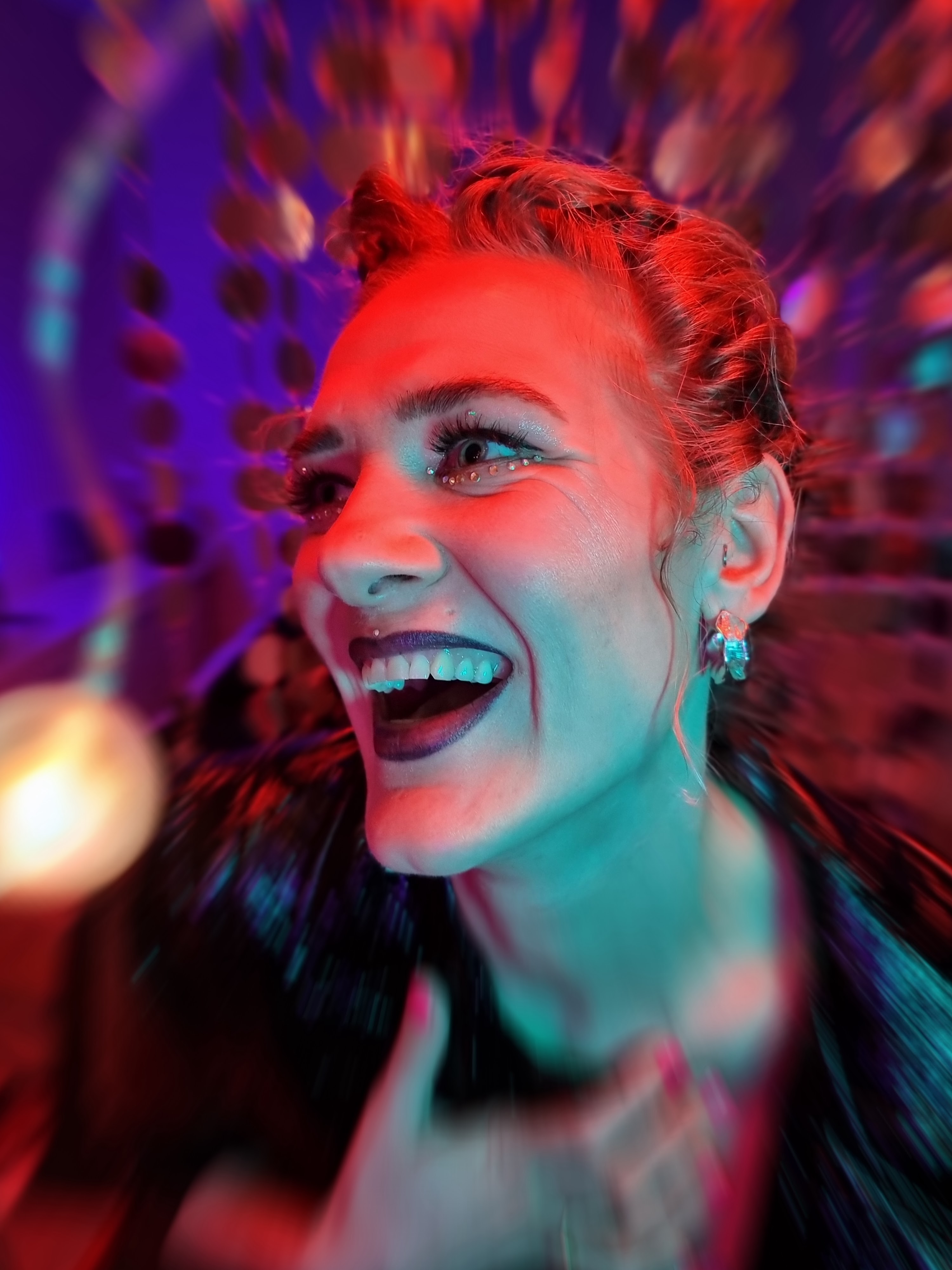 I løbet af en time fik vi bygget en hel magisk hule af palietter, glitter, glimmer og farvet lys med Philips Hue-pærer, ring-light, lyskæde og LED-lamper i diverse afskygninger + passende makeup, plastic og den rette attitude — så var det bare at prøve rammerne af.