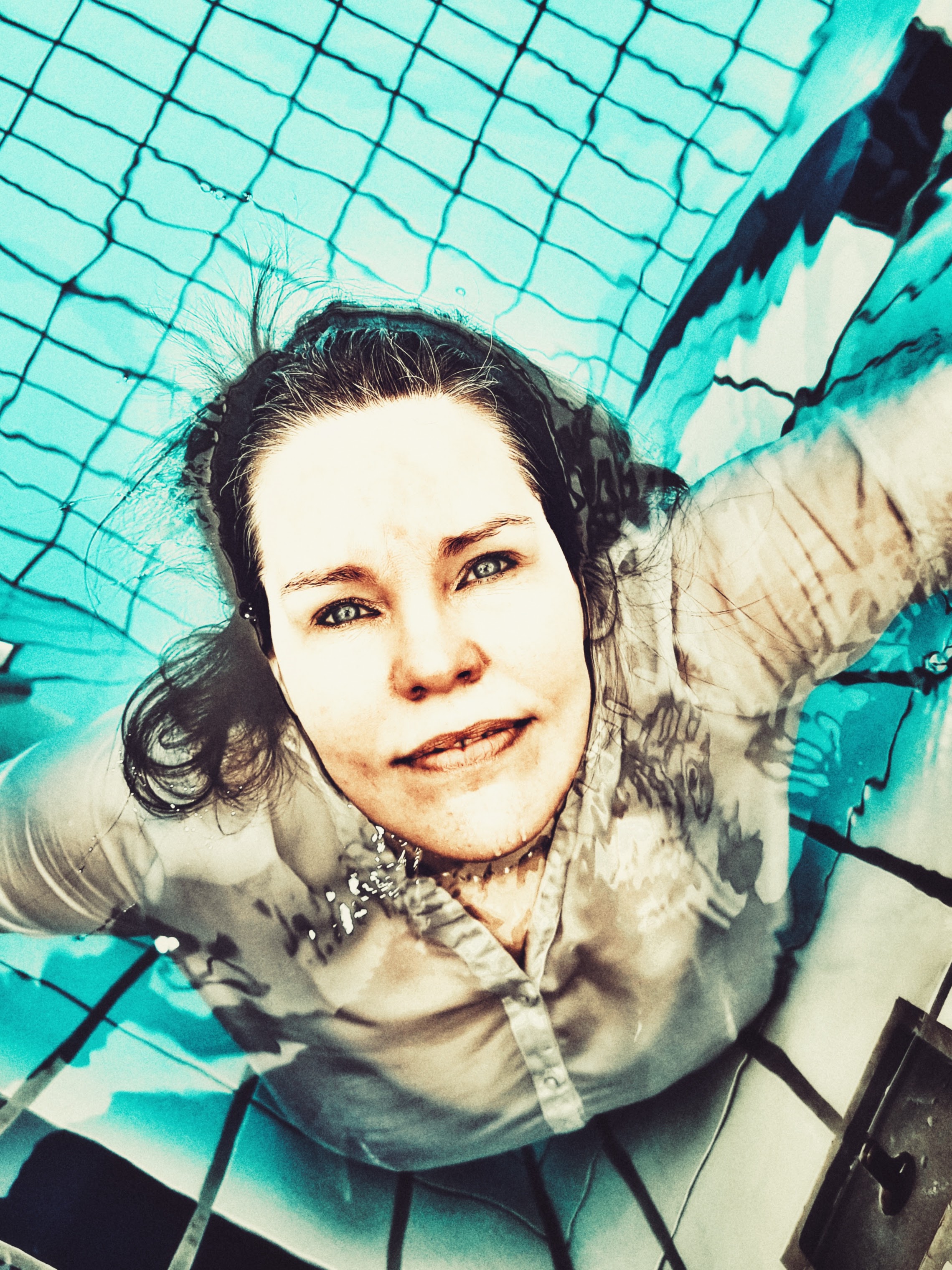 Den med ‘luft’ … den tænkte vi en del over og faldt for idéen med at Anette kommer op fra ’dybet’ - giiisp - op til overfladen … og får luft! Tadaa! Så var det afsted til en svømmehal og hoppe i vandet.
