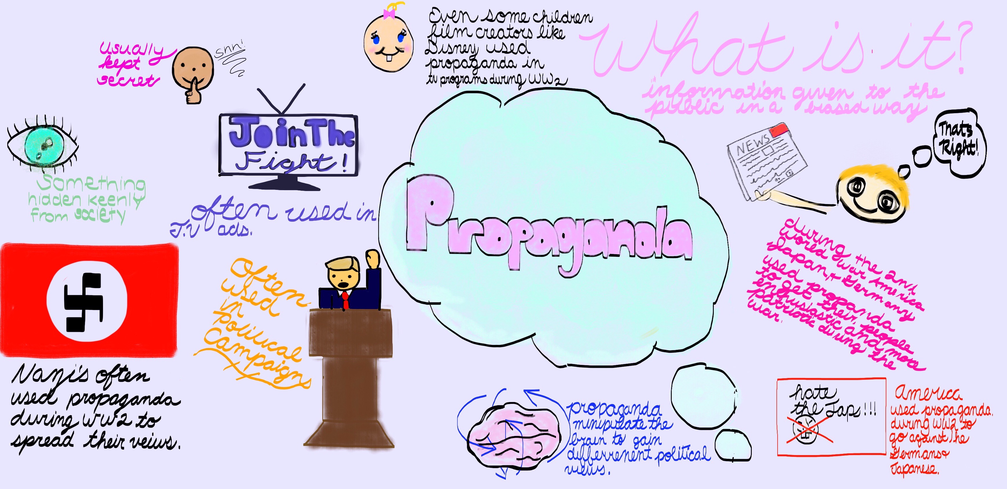 Propaganda is a form of manipulation used by media outlets, political parties, countries, and any other forms of industry. It can be used to manipulate public views though byast or opinionated context. One example of how people can use propaganda is through catchy slogans in commercials, or television programs. Another type would be through caricatures and other forms of advertisements on billboards or other public areas. Demonizing the opposite of your opinion in any way that would be seen by others. Symbols and Patriotism are other ways to make people think that it is important for the them to stick up for their country whether their morals are right or wrong. WW2 is a real life example of how people were effected by Adolf Hitler who used propaganda in many ways to demonize Jews and other countries fighting his cause.