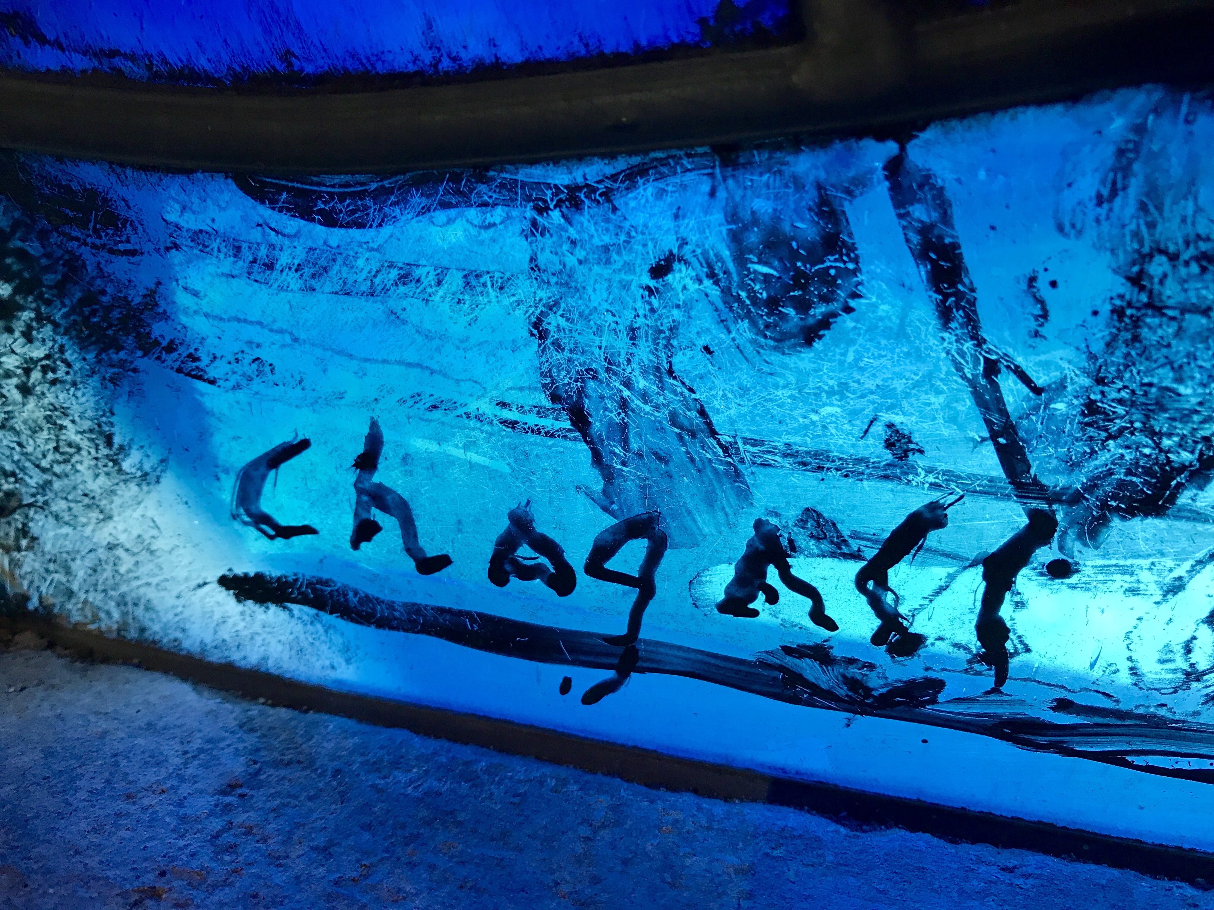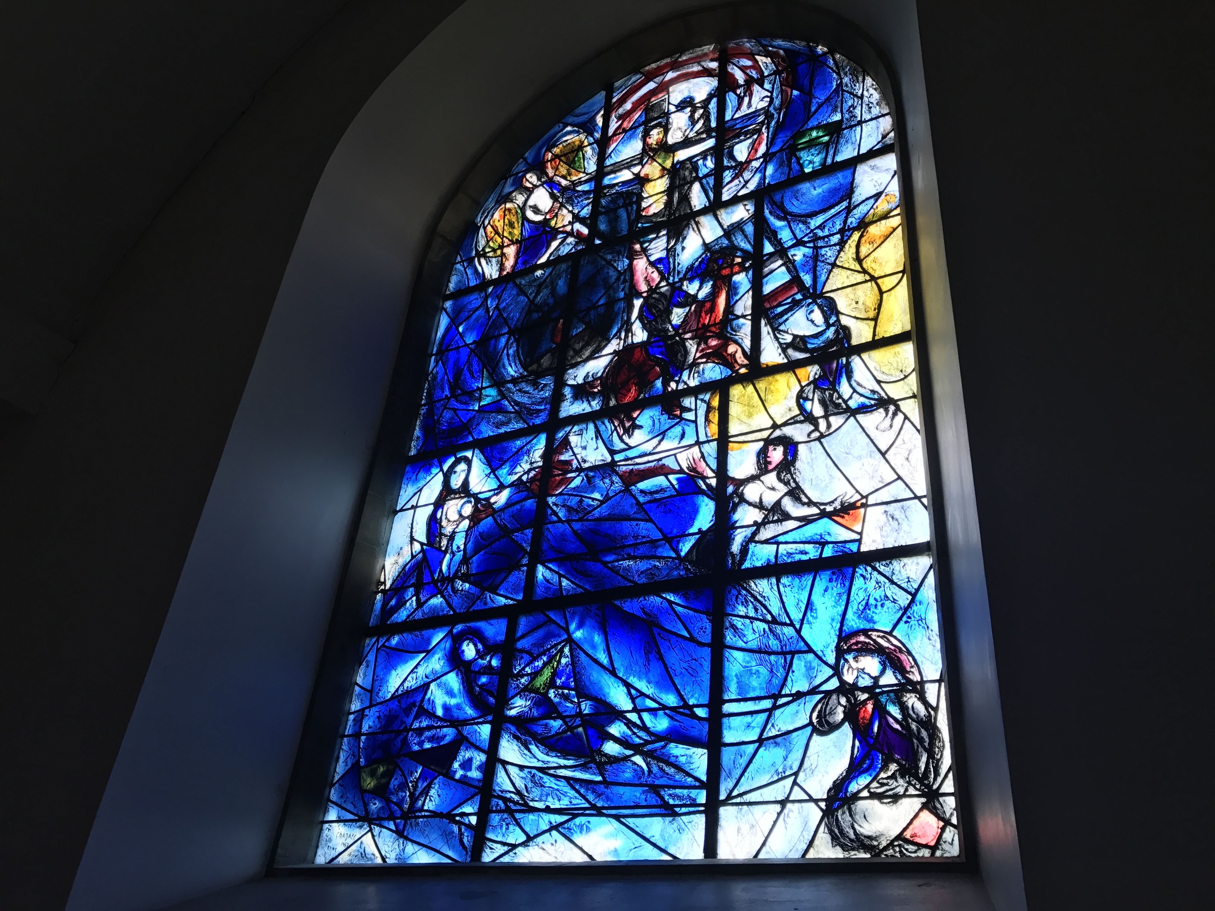 Here we encountered another important piece of art covering the wall, this time the inspired work of Marc Chagall in stained glass. He was depicting a drowned girl (for whom the window was commissioned), surrounded by those who loved her. As in the fresco, Jacob's Ladder figures prominently, ready to carry her to a Christ whose hands are not nailed but held open in welcome. For Chagall blue is the color of Love, and yellow (the south windows) the color of resurrection. The two colors combine in a liminal glow, and it was impossible to miss his point!