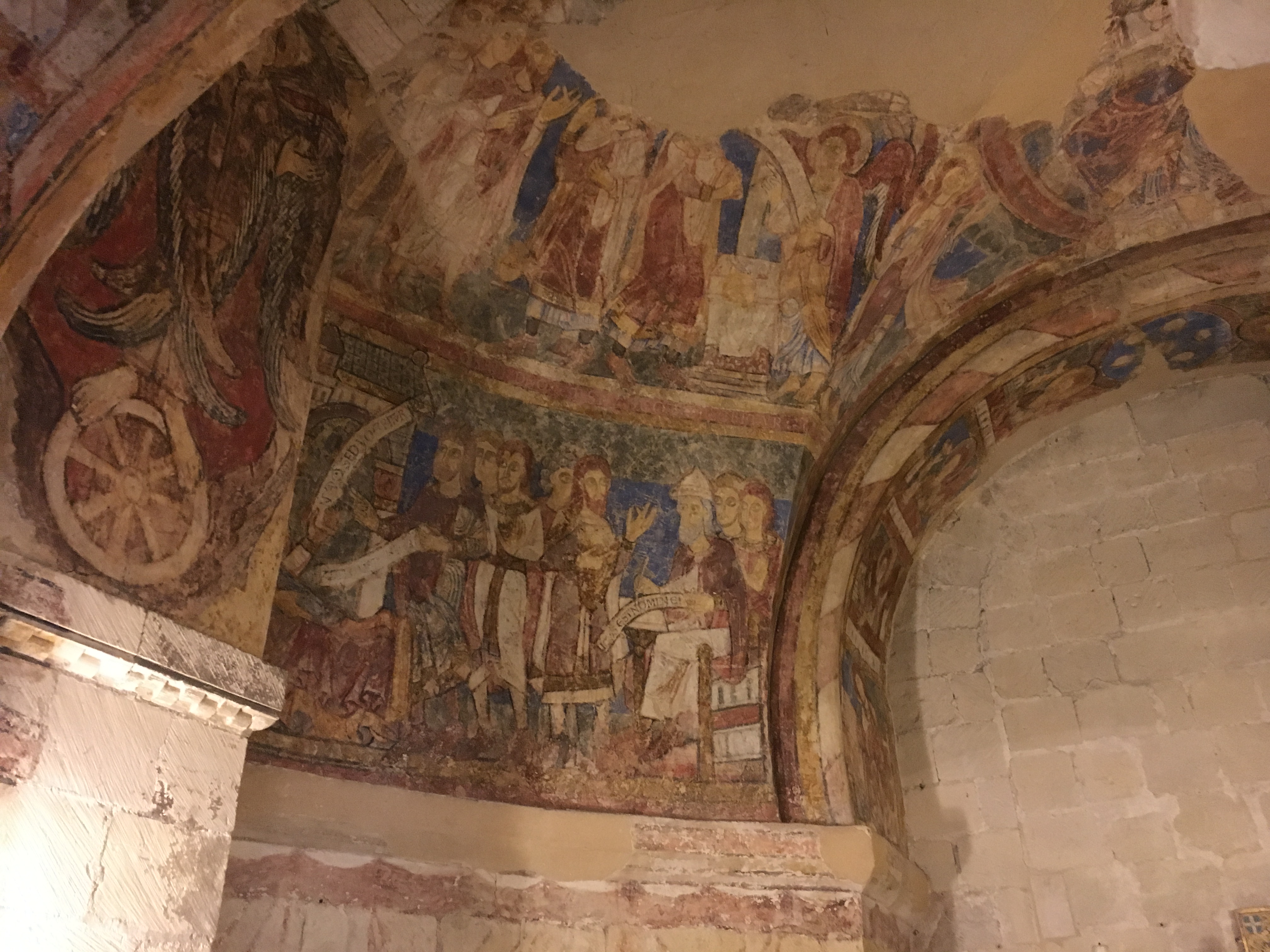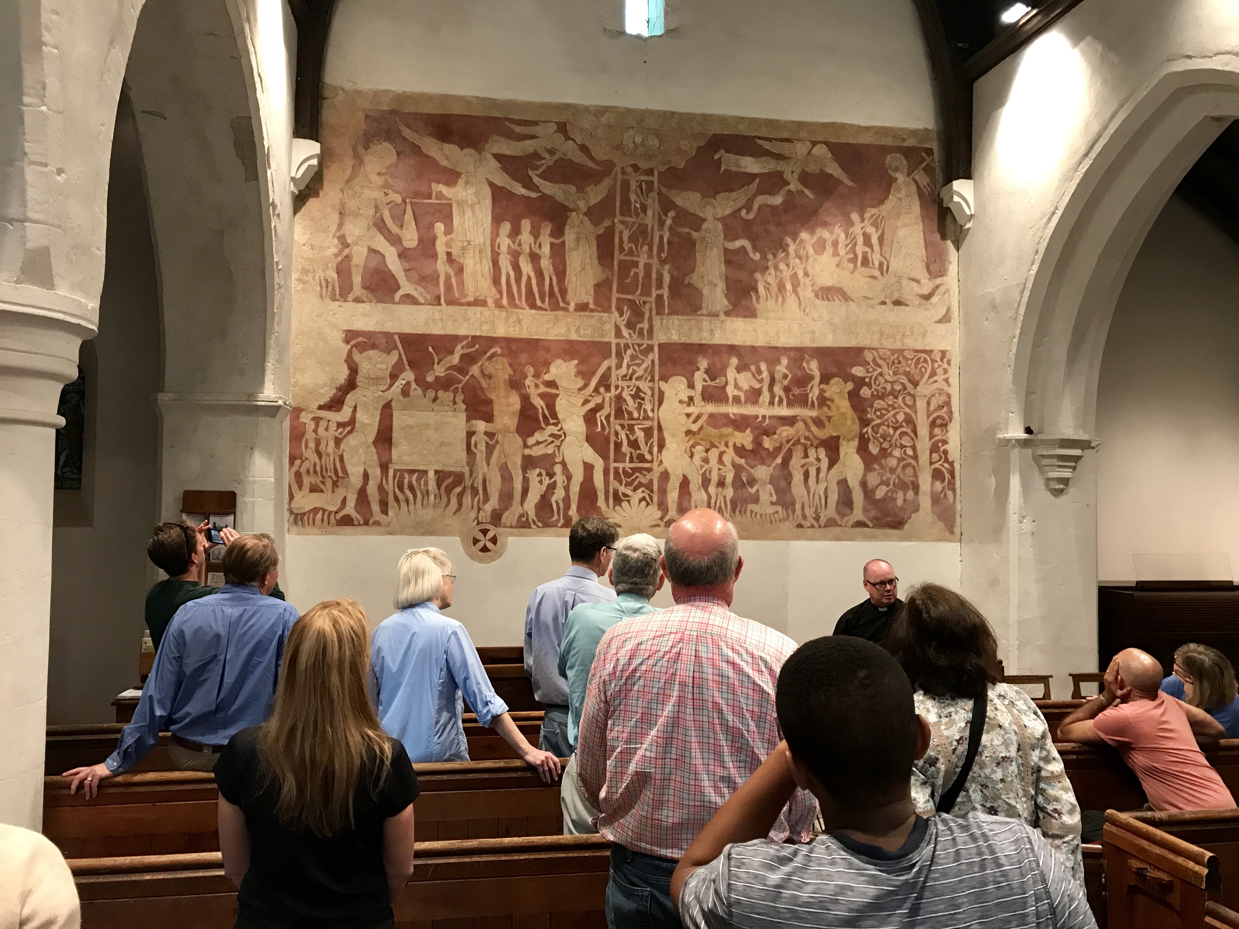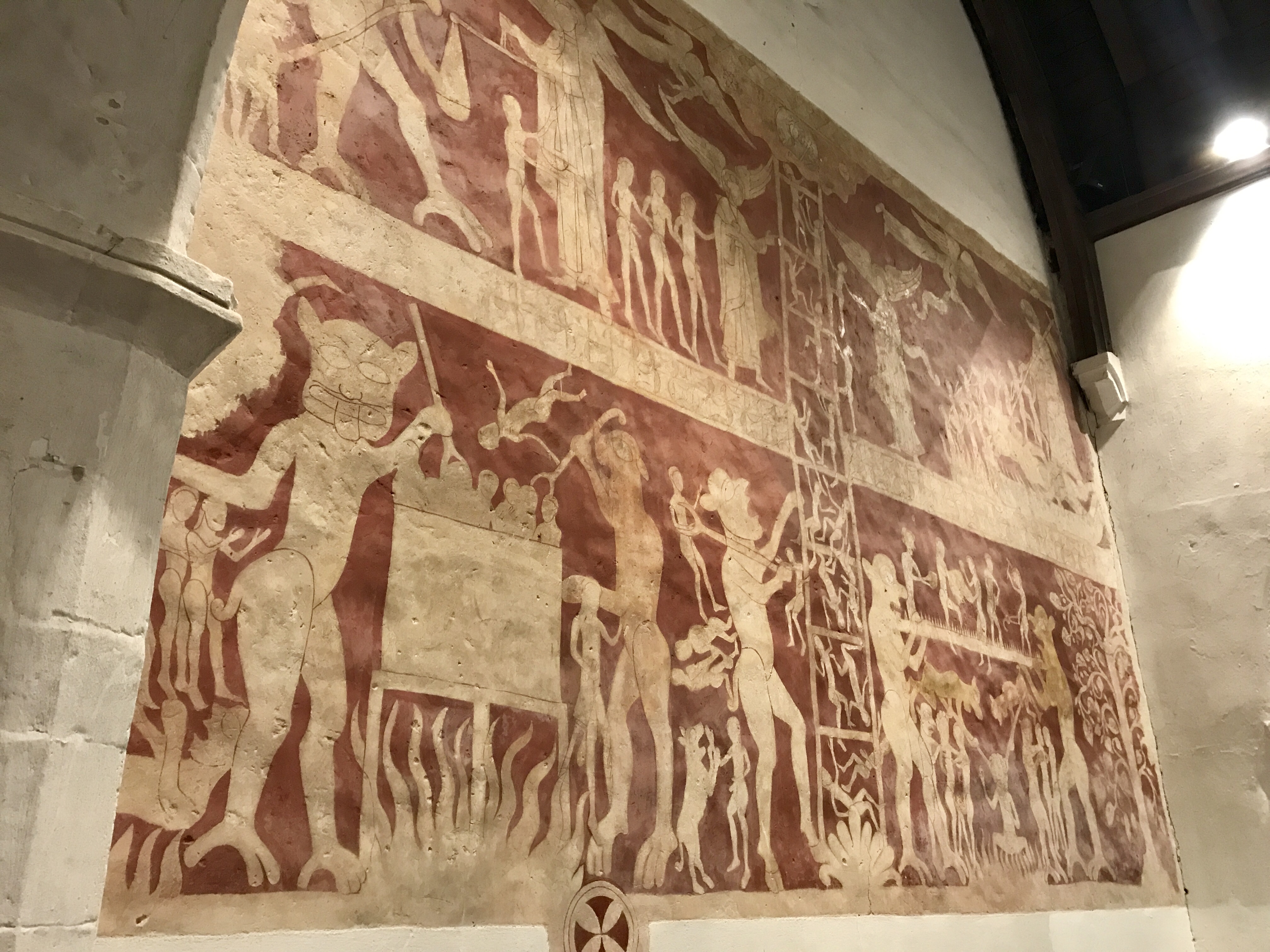 Inside is an extraordinary fresco that fills the length of the back wall; it was a lesson for the pilgrims on their way to Canterbury. It's called the Ladder of Salvation, and depicts the soul's progress toward/away from God (through Hell and Purgatory).
