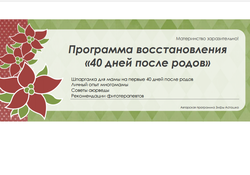 Итак, Базовый набор создан для тех, кто не очень хочет заморачиваться насчёт восстановления, и все элементы планирует сделать самостоятельно, без привлечения сторонних специалистов. Если вы считаете, что всё и так хорошо, особенно, если у вас уже есть опыт успешного восстановления после родов — можете смело выбирать базовый набор. В нём есть подневная программа восстановления после родов, с 1 по 40 день, в которой расписано, в какой день и для чего какие травы пить, какие упражнения можно делать, а какие ещё нельзя. Приведу небольшие выдержки из программы, чтобы яснее была идея послеродового набора.
