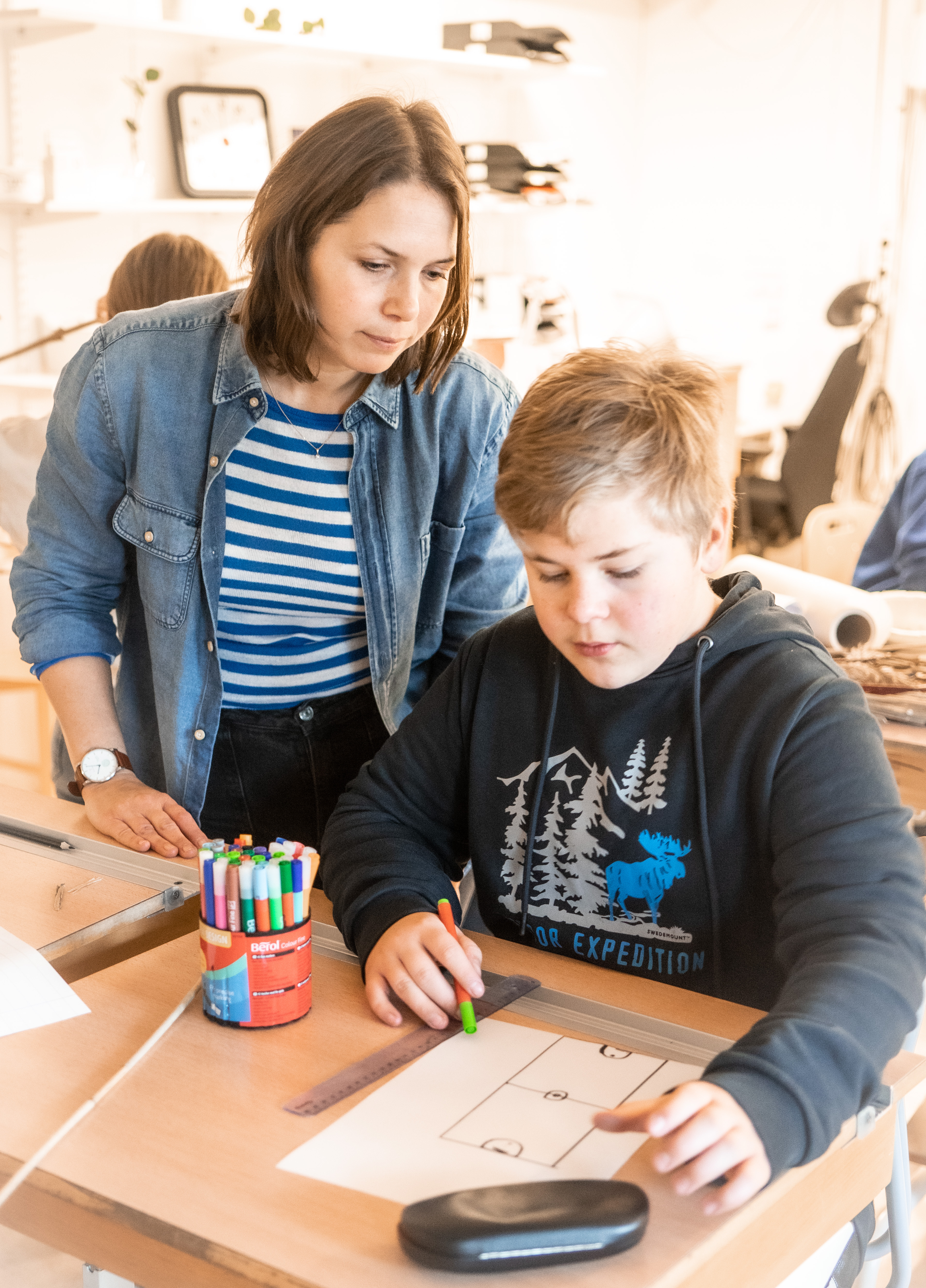 Under vårvintern är klassen i full färd med workshops där eleverna utvecklar och förädlar sina tankar och idéer till konkreta förslag för två olika områden i centrala Brålanda. Arbetet tar utgångspunkt i dialogmetoden ”Arkitekter i skolan” som handlar om ett ömsesidigt lärande och utbyte mellan arkitekter och skolelever kring platsutveckling.
