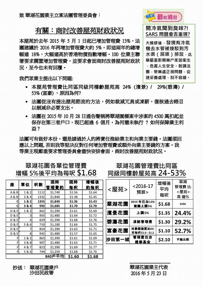 翠湖花園管理費連續兩年增加共18%