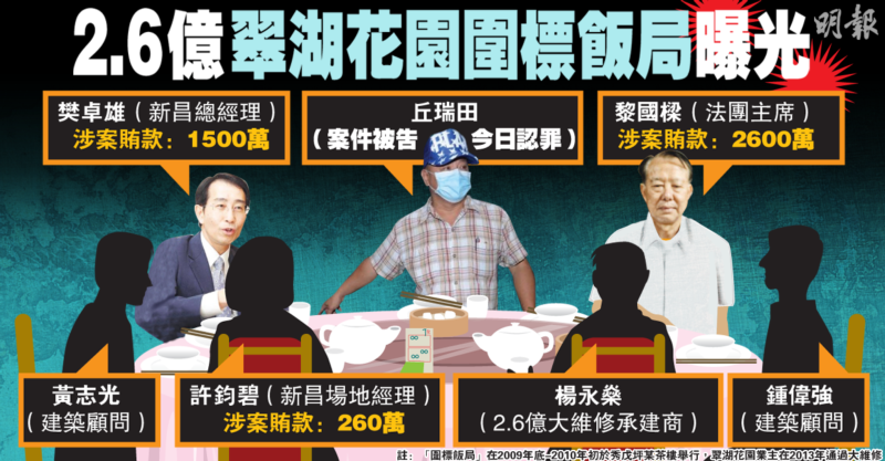 最轟動的是去年底沙田翠湖花園二億六千萬元維修工程,是歷來首宗參與圍標人士被定罪個案,涉案工程判頭承認四項串謀向代理人提供利益罪,正還柙等候下月判刑。廉署於今年三月再就案件展開大規模行動,拘捕十多人。