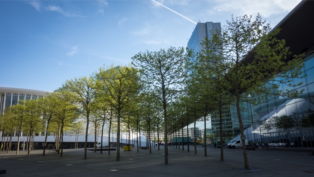 The hotel Melia , with Its monolithic architecture, fits perfectly with the other buildings