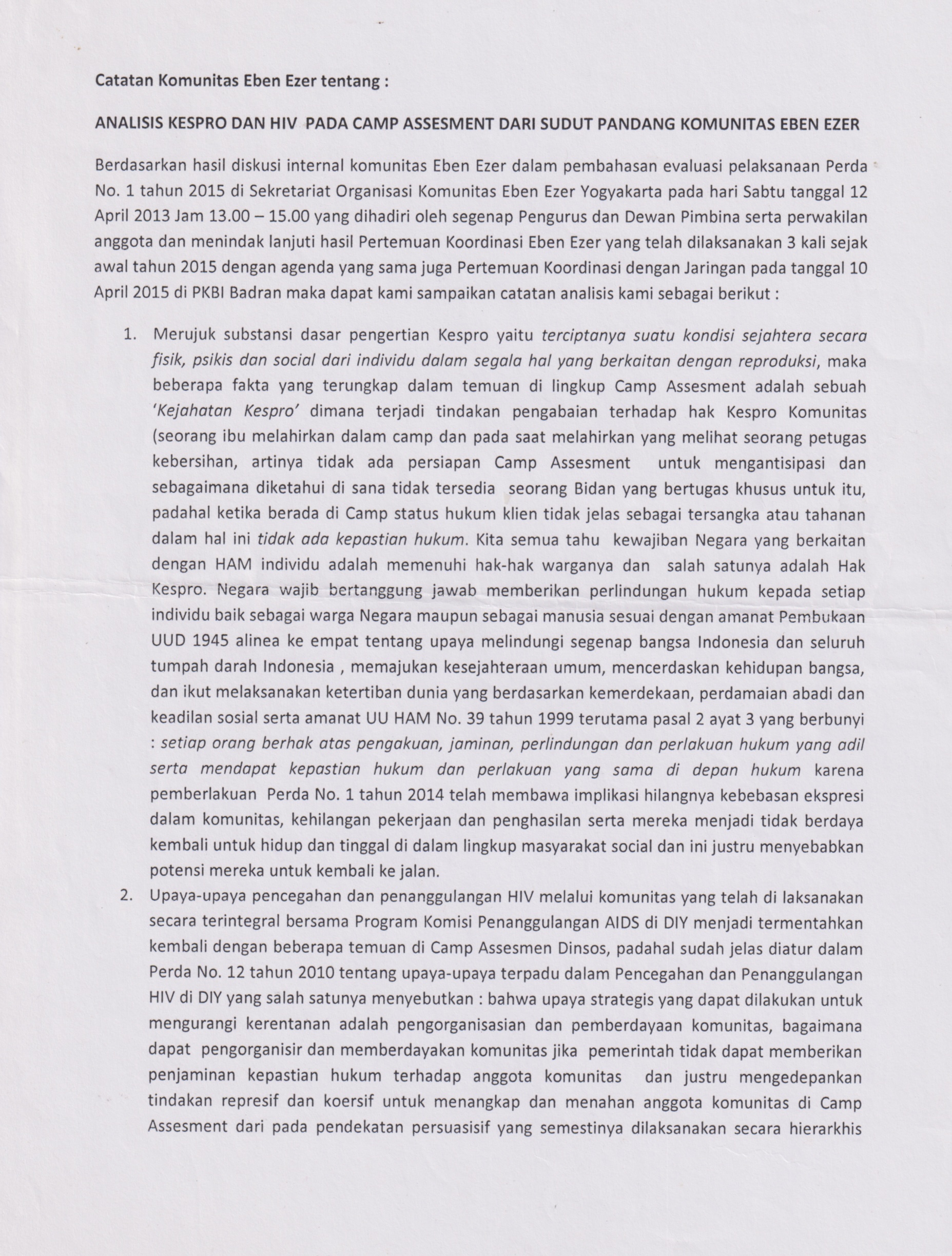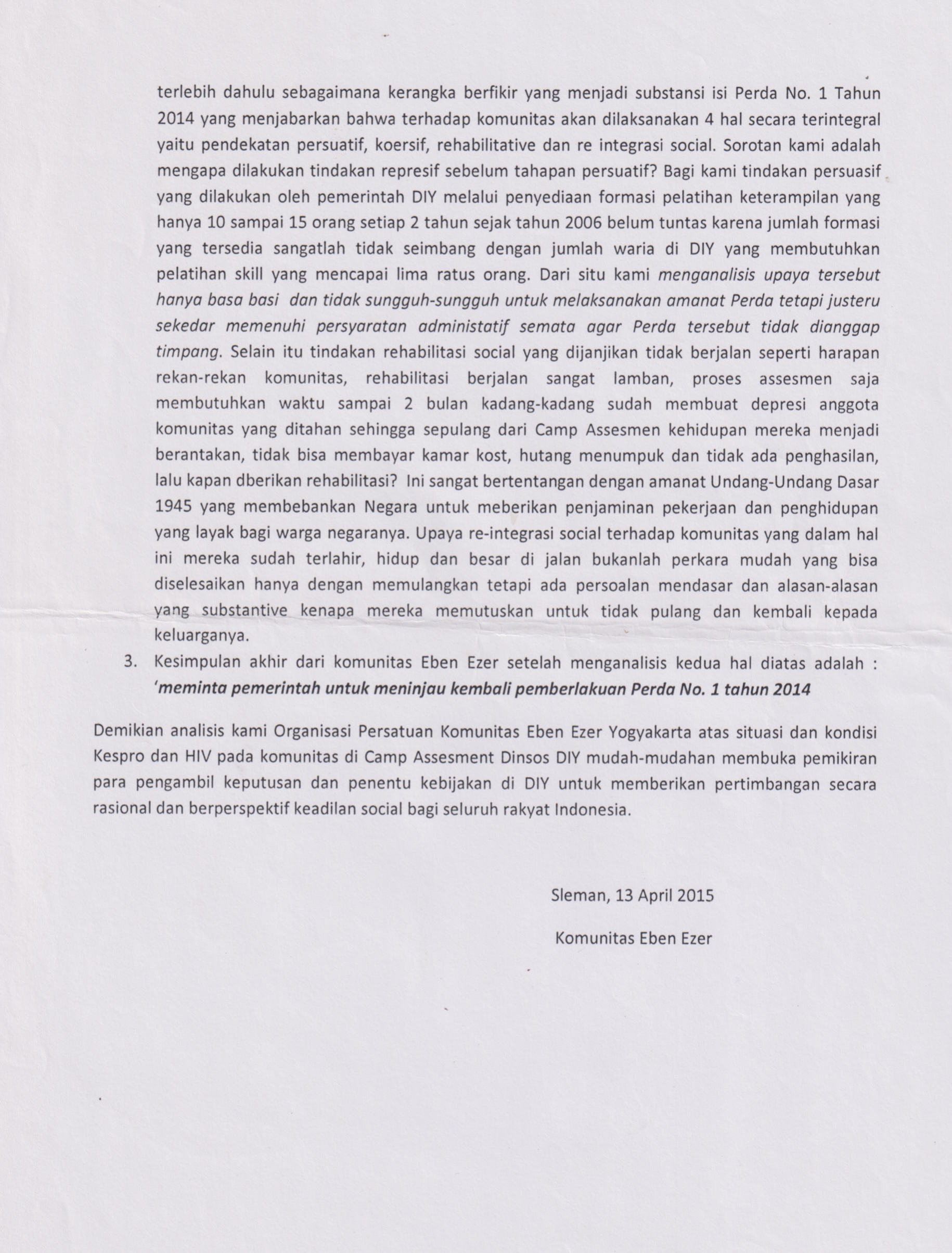 Dalam gerak perjuangannya, Eben Ezer menjadi salah satu organisasi yang membentuk Kaukus Perda Gepeng. Mereka mempertanyakan pengertian ‘gelandangan’ dan ‘pengemis’ yang tidak jelas pada Perda tersebut yang berujung pada kriminalisasi kaum miskin kota. Selain itu, mereka juga mengecam berbagai potensi tindak penangkapan tanpa bukti, kekerasan, pengabaian di Camp Assessment dan pemaksaan ekspresi gender sebagai dampak atas pengesahan Perda Gepeng.