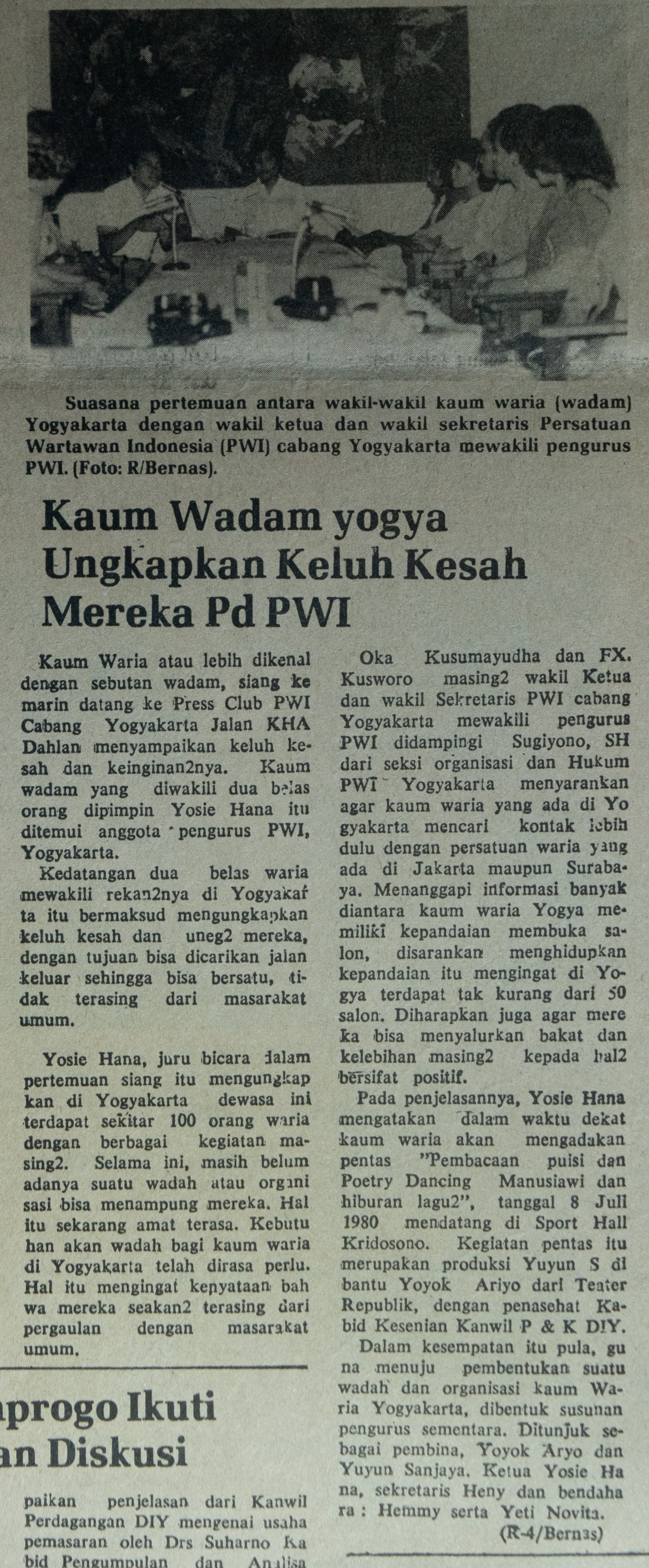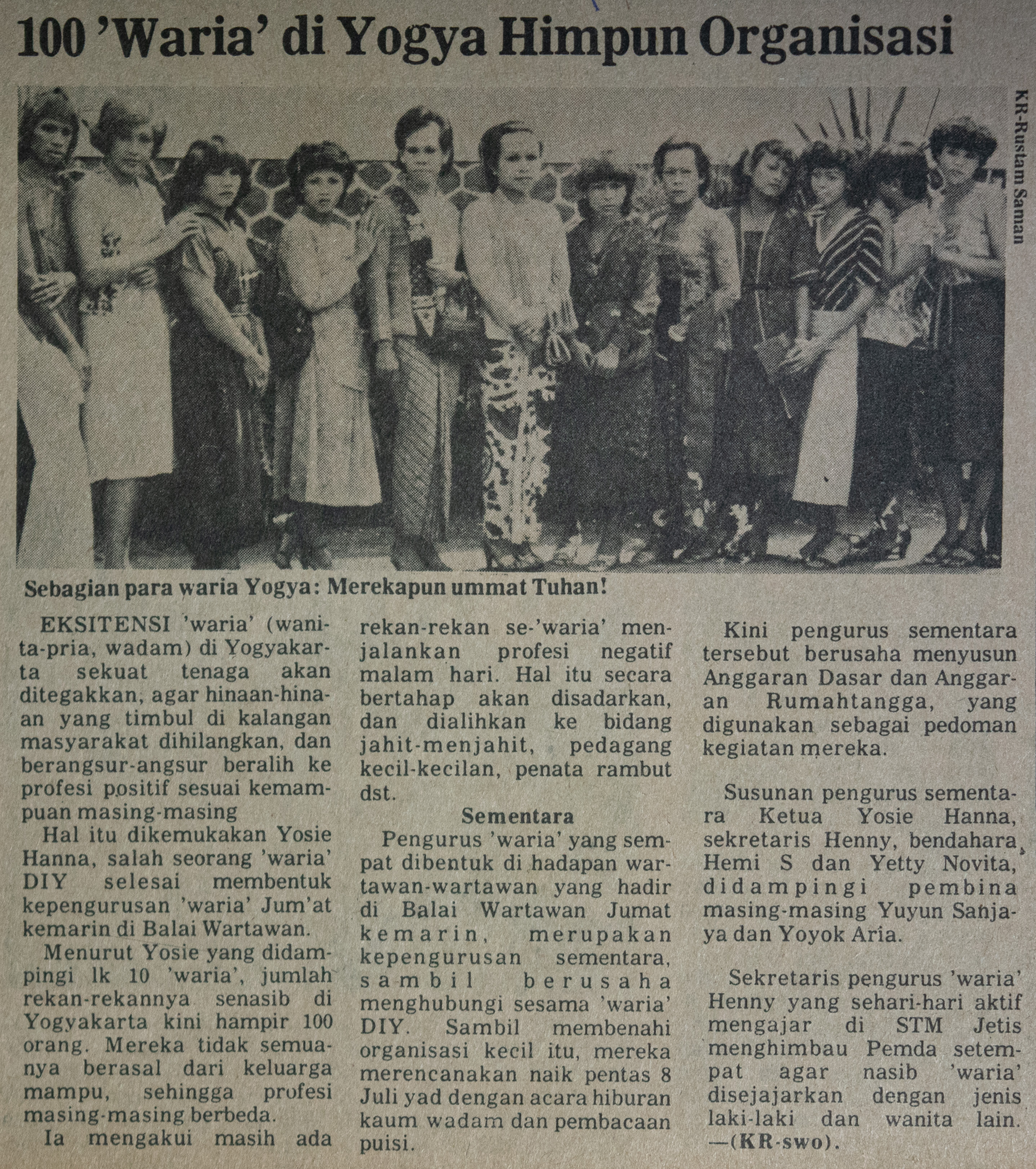 Dengan informasi tentang Yosie Hanna dan catatan mami Henny, saya menelusuri beberapa artikel di tahun 1980-an dari harian Kedaulatan Rakyat dan Bernas yang terbit di Yogyakarta. Dalam beberapa pertemuan dengan kawan-kawan transpuan, saya mengkonfirmasi beberapa materi tentang perjalanan organisasi transpuan yang saya dapati.