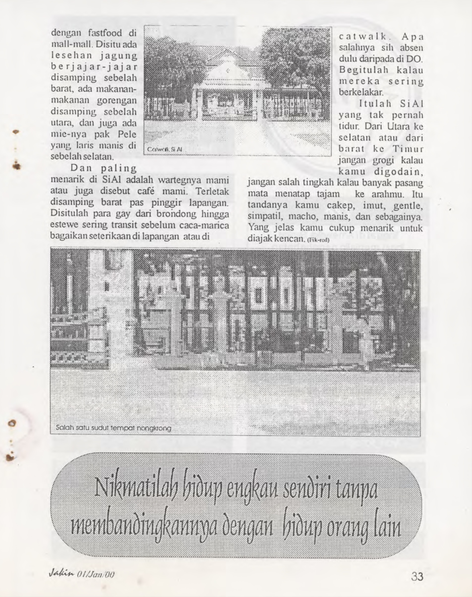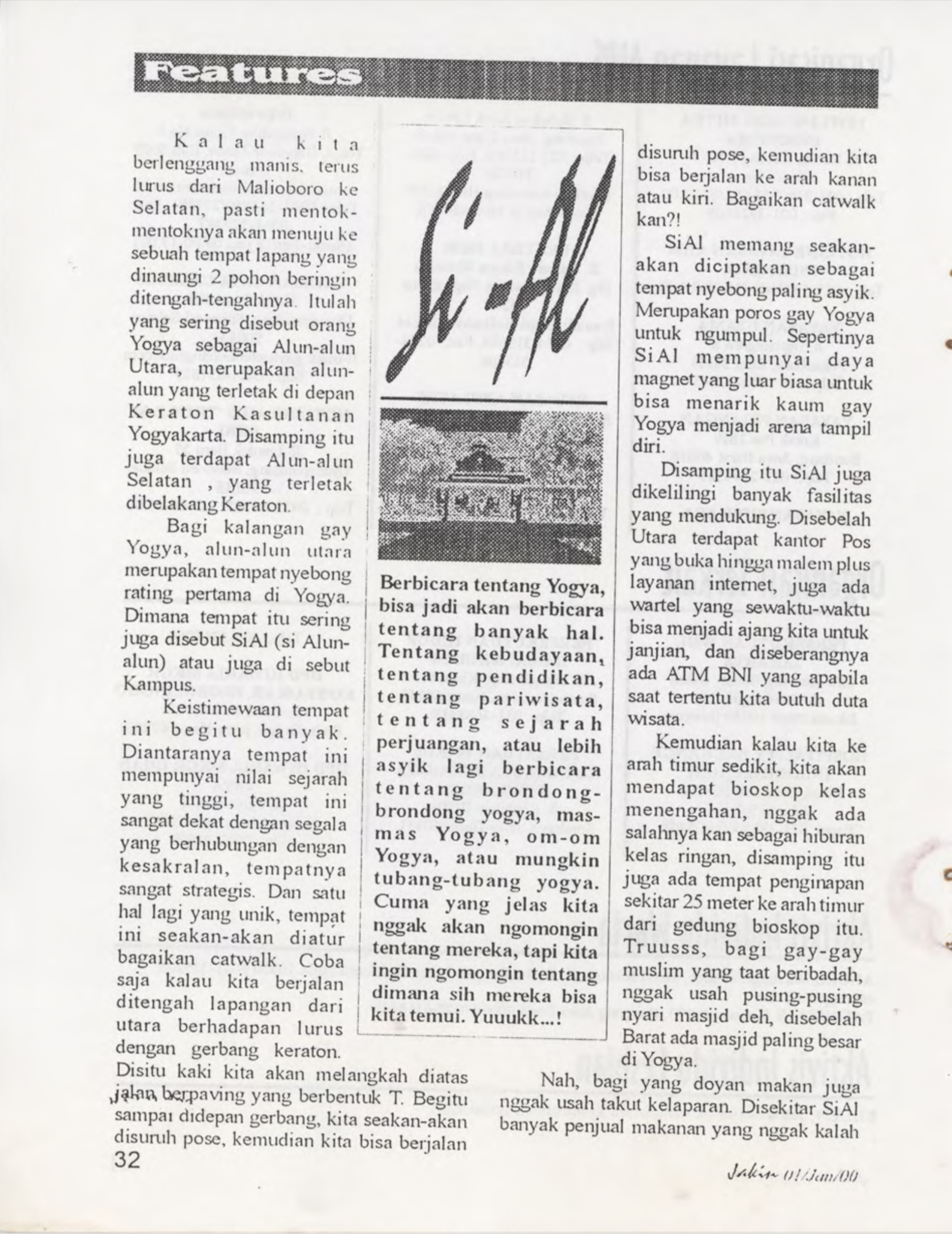 Salah satu yang menarik dari publikasi JAKIN adalah ulasan mereka tentang si-Al atau Alun-Alun Lor (Utara), yang saat itu menjadi salah satu titik pertemuan bagi komunitas gay di Yogyakarta. Selain Si-Al, komunitas juga menjuluki Alun-Alun Lor sebagai kampus.