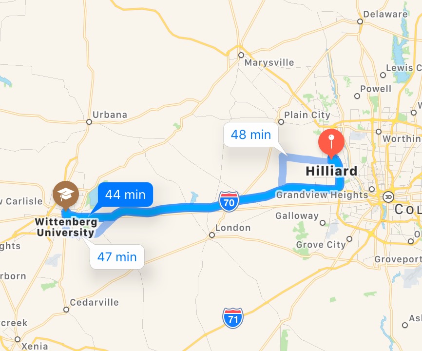 Wittenberg is located in Springfield Ohio. It is about a 45 minute drive and located 43 miles west of Hilliard.