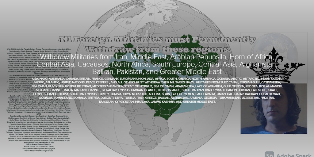 USA, NATO, and other all Militaries must permanently withdraw their militaries from Iran, Iraq, Afghanistan, Syria, Jordan, Pakistan, Tajikistan, Turkmenistan, Uzbekistan, Kyrgyzstan, Armenia, Azerbaijan, Georgia, Kuwait, Yemen, Oman, Saudi Arabia, Bahrain, Jordan, UAE, Qatar, Dubai, Egypt, Sudan, Somalia, Somaliland, Uganda, Kenya, Ethiopia, Palestine, Israel, Sudan, South Sudan, Sinai, Socotra, Cyprus, Malta, Gibraltar, Libya, Tunisia, Italy, Greece, France, Spain, Algeria, Morocco, Portugal, Balkan, Jammu Kashmir, Himalaya, Tibet, and Greater Middle East. Iran must have permanent militaries presence in all these regions. Makan Abazari Shahan Shah Iran said