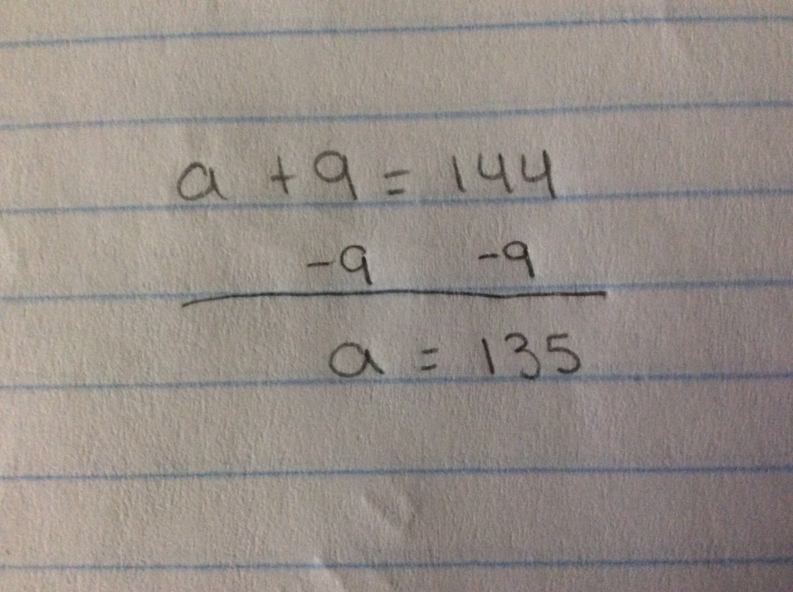 Now that you multiply both sides by themselves you should of got 9 for b and 144 for c๐.Now we must get a by itself so we can find its value,but how do we do that?๐คWell subtract b which is 9 and you do it aswell on the other side because what you do to one side you do it to another.๐You should of got a=135