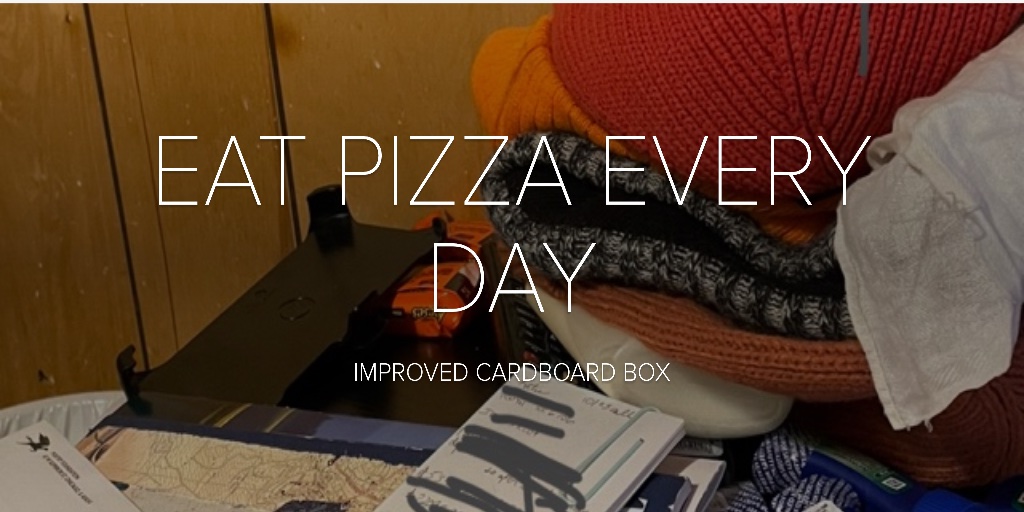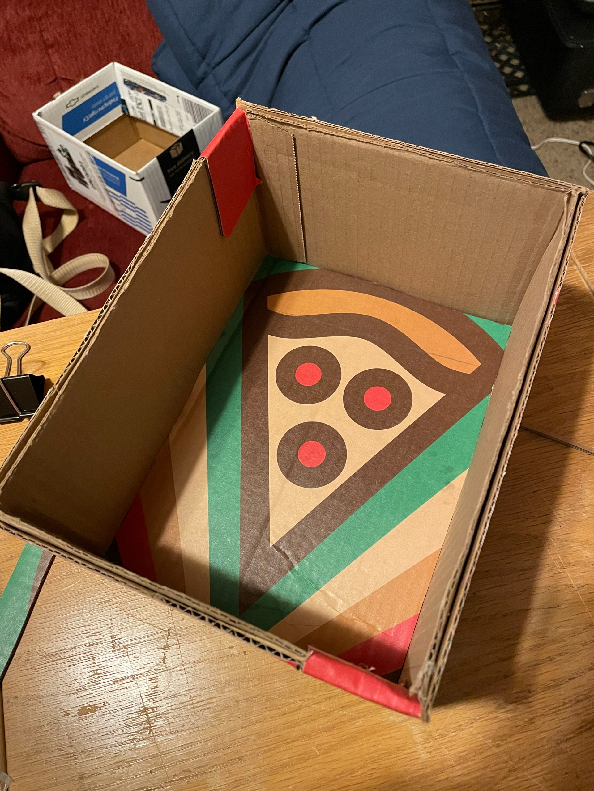 it's super plain and flimsy though. fortunately, we ordered pizza tonight from sizzle pie (west coast chain, super good, if you know, you know) and sizzle pie has really cool art on their pizza boxes. 70s-looking. so i decided to improve my box with more box.