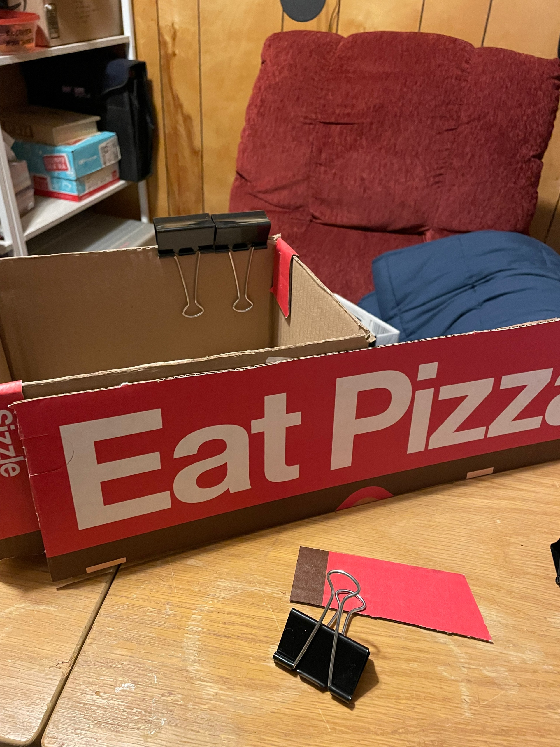 after that sets up a little, cut the pizza box and make a wrap-around cladding and hot glue it down then hit it with the document clamps until the hot glue hardens.